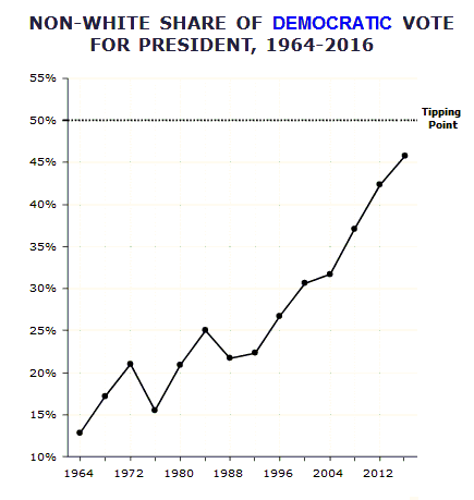 This graph is not all bad news. Besides indicating the effect of Third World immigration it indicates whites fleeing the Democratic Party. See