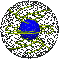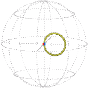 In the particular moving and untangling of the elastic already described, the motion is “planar,” that is, the axis-angle path lies in a plane and the Euler parameter path lies in an ordinary sphere. If we arbitrarily assign the three non-zero Euler parameters to three axes of ordinary space we obtain the following path motion. (In the pictures below, the reference point (1, 0, 0, 0) → (1, 0, 0) is the extreme right point of the sphere.)