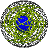 The position of the stationary rim is represented by ± (1, 0, 0, 0) in Euler parameters. A position of the elastic is represented by a path starting from this point. If one of the last three of the four coordinates is zero all along the path, you can take a cross-section of the sphere in four dimensions to obtain an ordinary sphere in three in three dimensions – a “great sphere” analogous to a great circle – that contains the entire path. (In the axis-angle representation the same path will lie in a plane, as described in the previous section.)