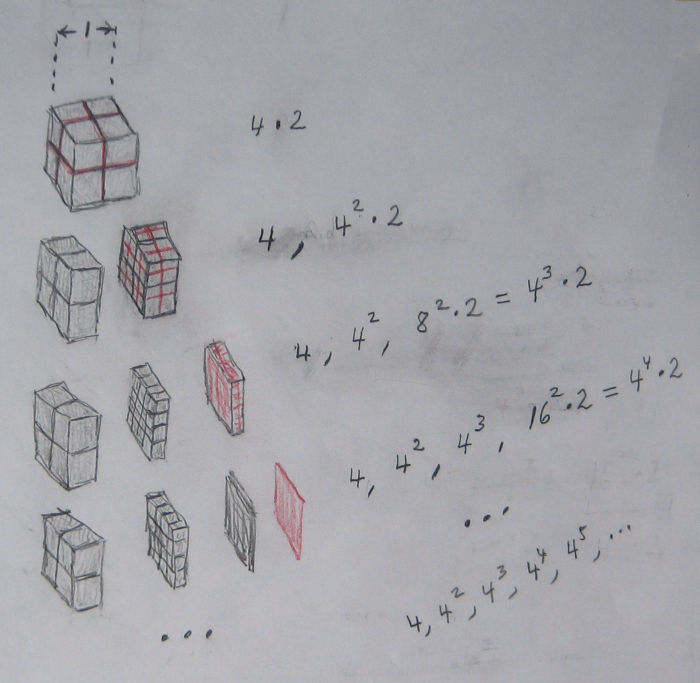 ** By lateral surface we mean the surface parallel to the xy or xz planes and neglecting surface perpendicular to the x-axis. Even were we to include the latter it wouldn’t matter because it turns out the former is infinite. However it is easy to figure out what it is. Imagine looking at the trumpet along the x axis from +∞. You would see only the area perpendicular to the x axis and its total is the same as the facing side of the first cube of width 1, the sillouette of the trumpet. Thus the non-lateral surface area is 1.