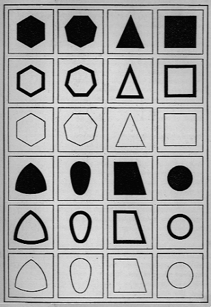 I happened once to see a two-year-old child, son of a medical colleague of mine, who, fairly fleeing away from his mother who had brought him to me, threw himself on the litter of things covering his father’s desk, the rectangular writing-pad, the round cover of the ink-well. I was touched to see the intelligent little creature trying his best to go through the exercises which our children repeat with such endless pleasure till they have fully committed them to memory. The father and the mother pulled the child away, reproving him, and explaining to me that there was no use trying to keep that child from handling his father’s desk furniture, “The child is restless and naughty.” How often we see all children reproved because, though they are told not to, they will “take hold of everything.” Now, it is precisely by means of guiding and developing this natural instinct “to take hold of everything,” and to recognize the relations of geometrical figures, that we prepare our little four-year-old men for the joy and triumph they experience later over the phenomenon of spontaneous writing.