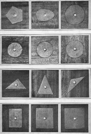 Exercises Related to Writing. The child passes to the plane geometric insets in metal. He has already coordinated the movements necessary to follow the contours. Here he no longer follows them with his finger, but with a pencil, leaving the duplicate design upon a sheet of paper. Then he fills in the figures with colored pencils, holding the pencil as he will later hold the pen in writing.