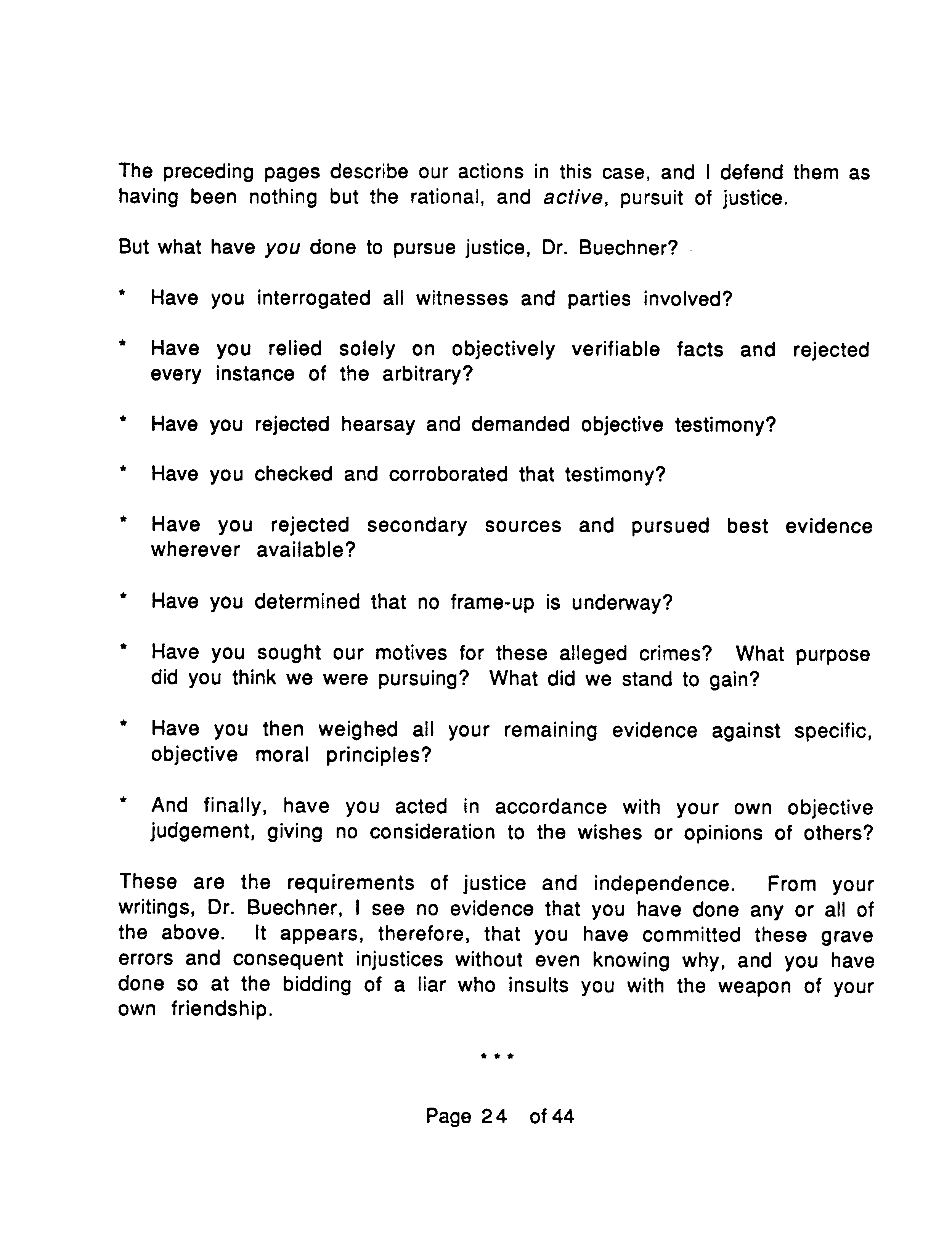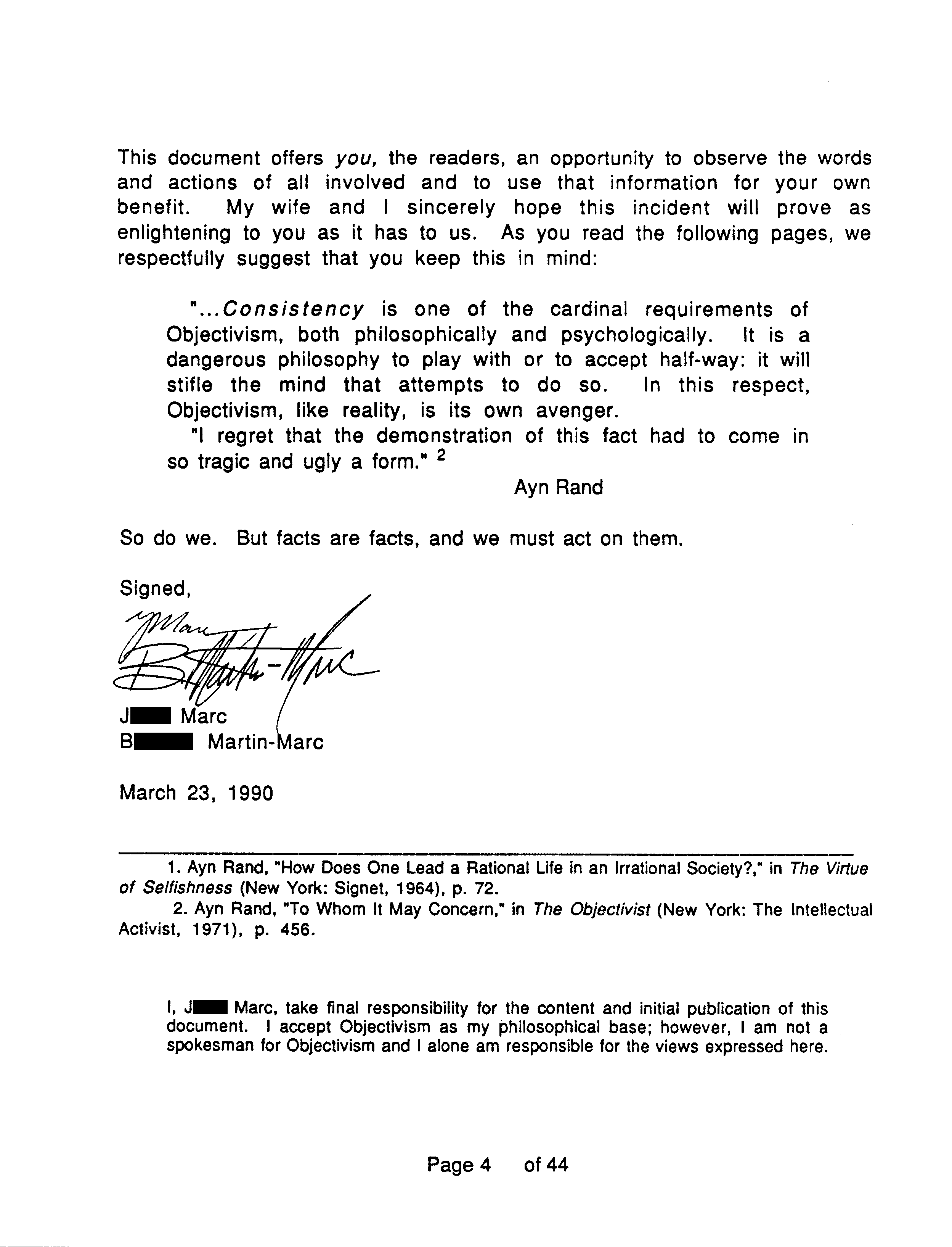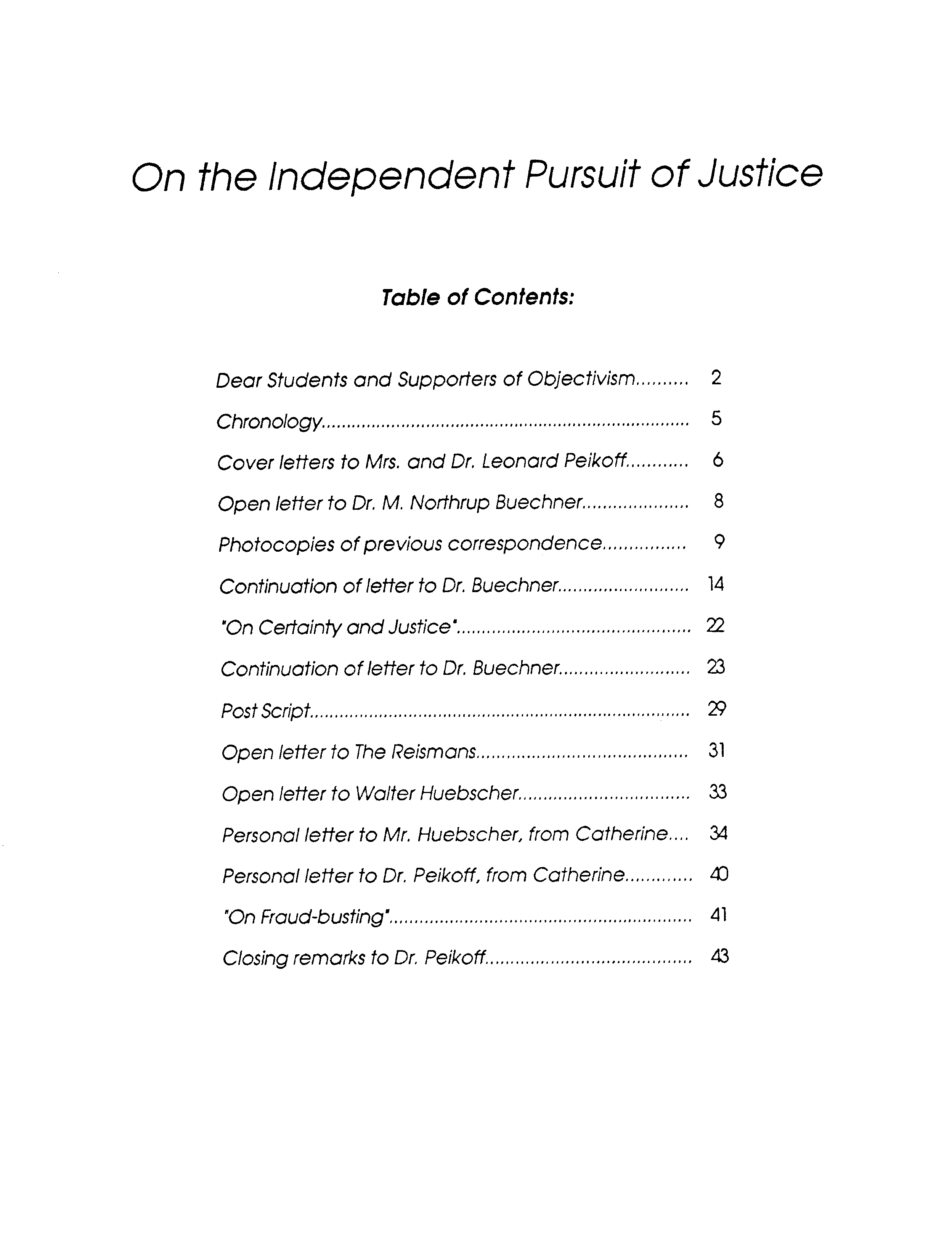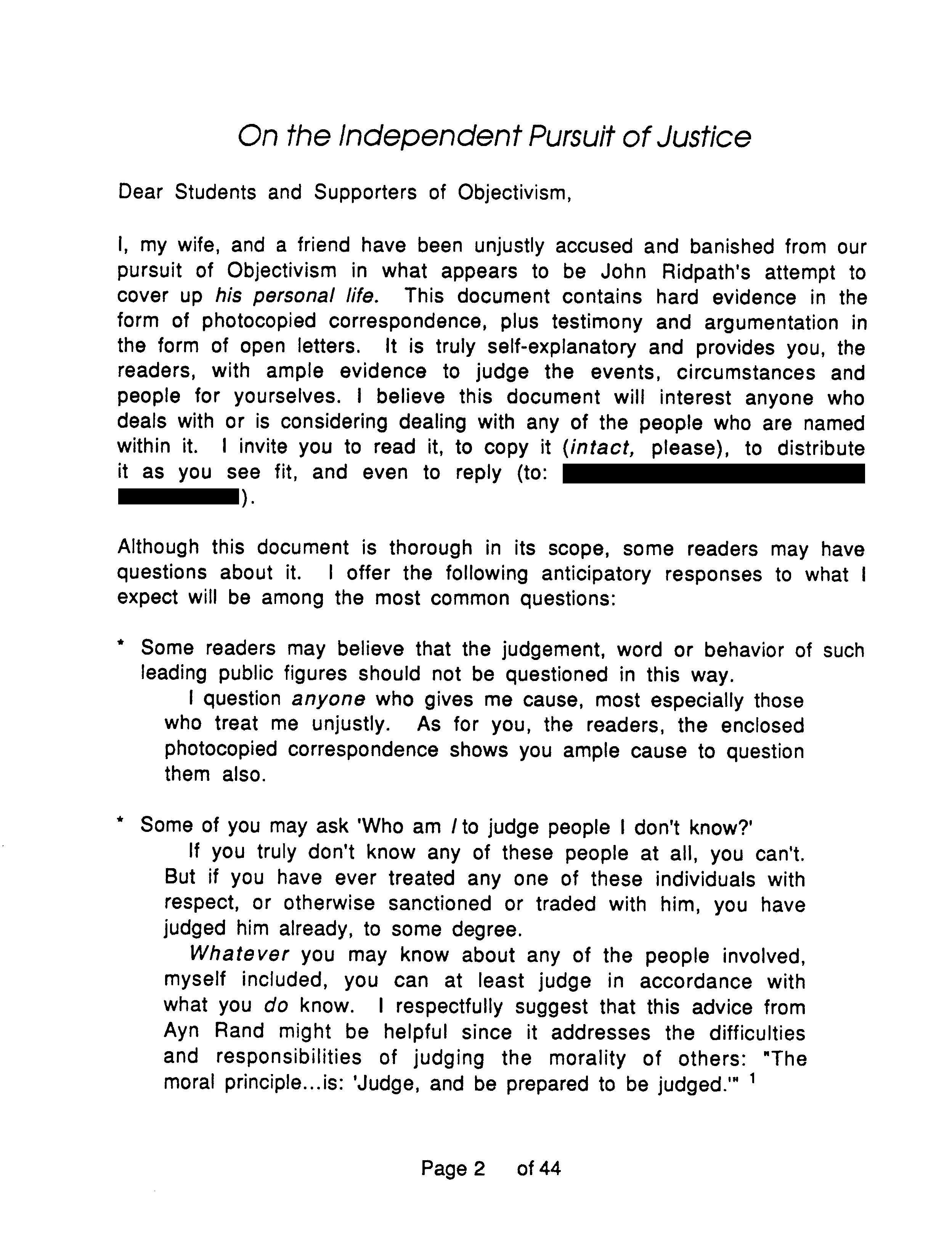 Back in 1990 several dozen people on the Objectivist (as in Ayn Rand) scene received a document in the mail with the above title. This webpage provides scans of its pages in picture format. The preface you are reading now was written in 2012 using testimony provided by one of the principal actors in the affair, B. Martin, and updated with corrections and additional material in 2018 using testimony of another, Catherine Farrar. Details not found in “On the Independent Pursuit of Justice” or commonly known within Objectivist circles are followed by an asterisk, like this: *