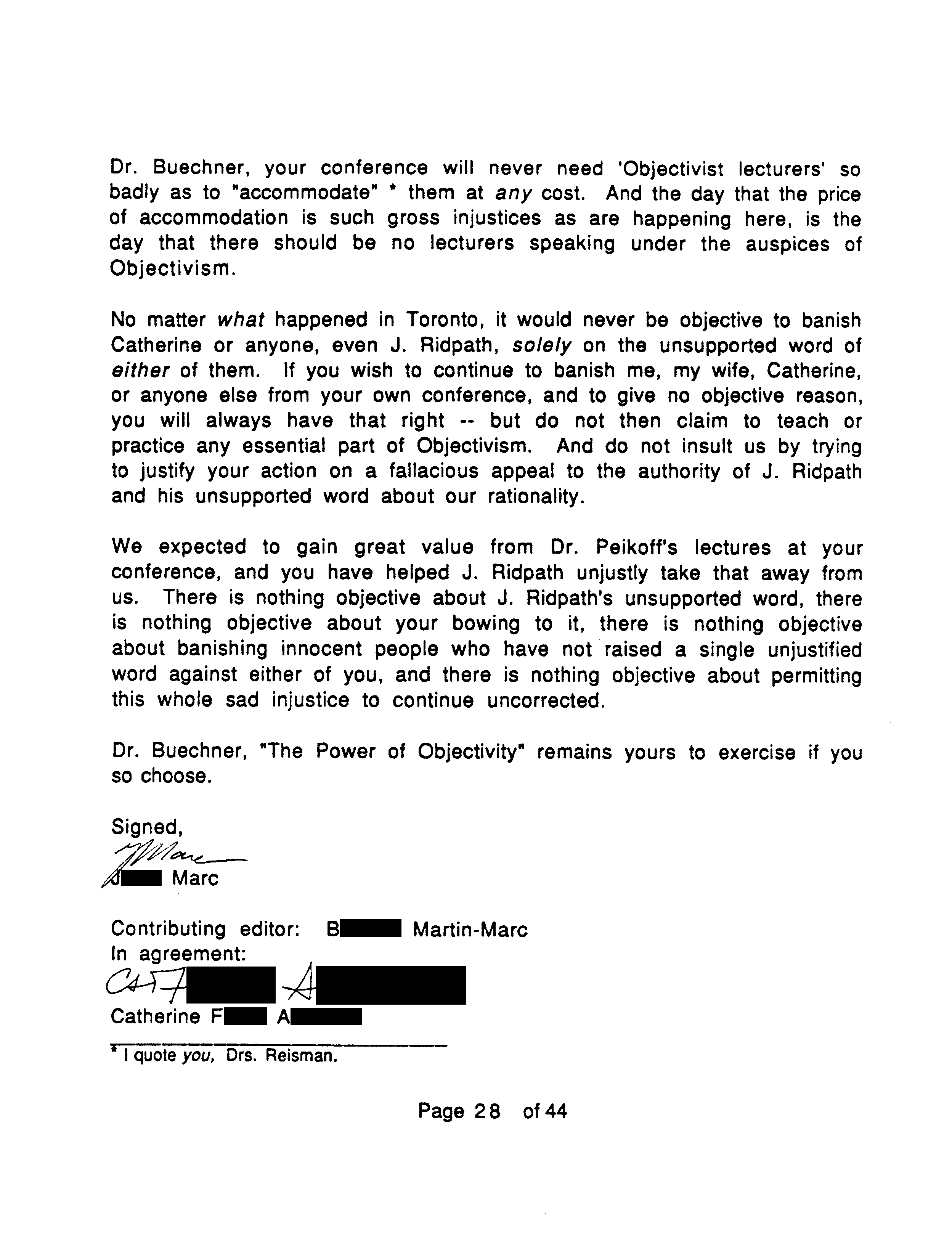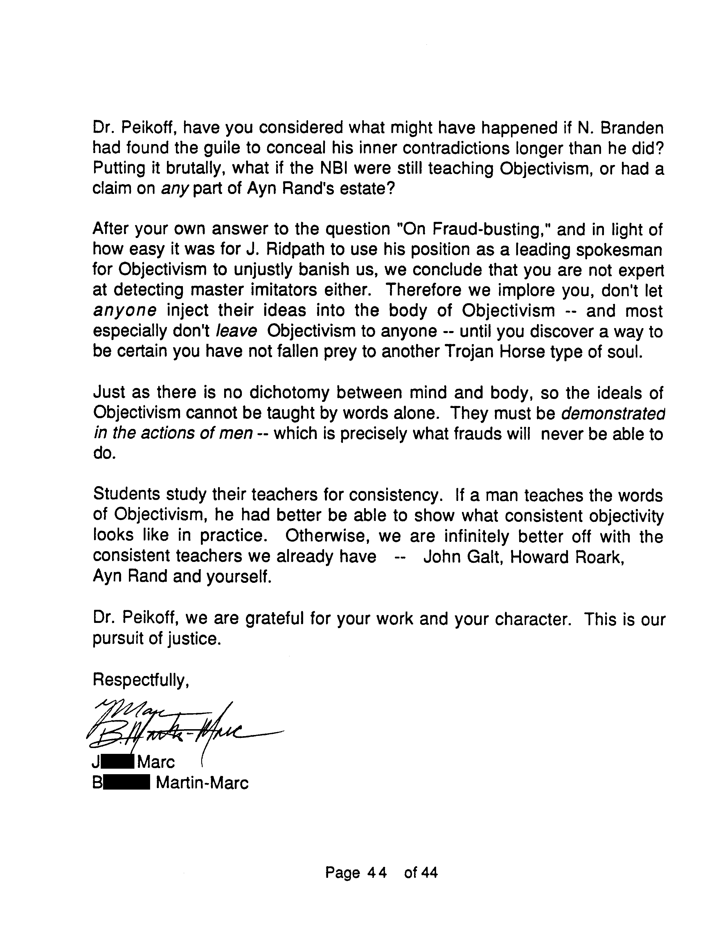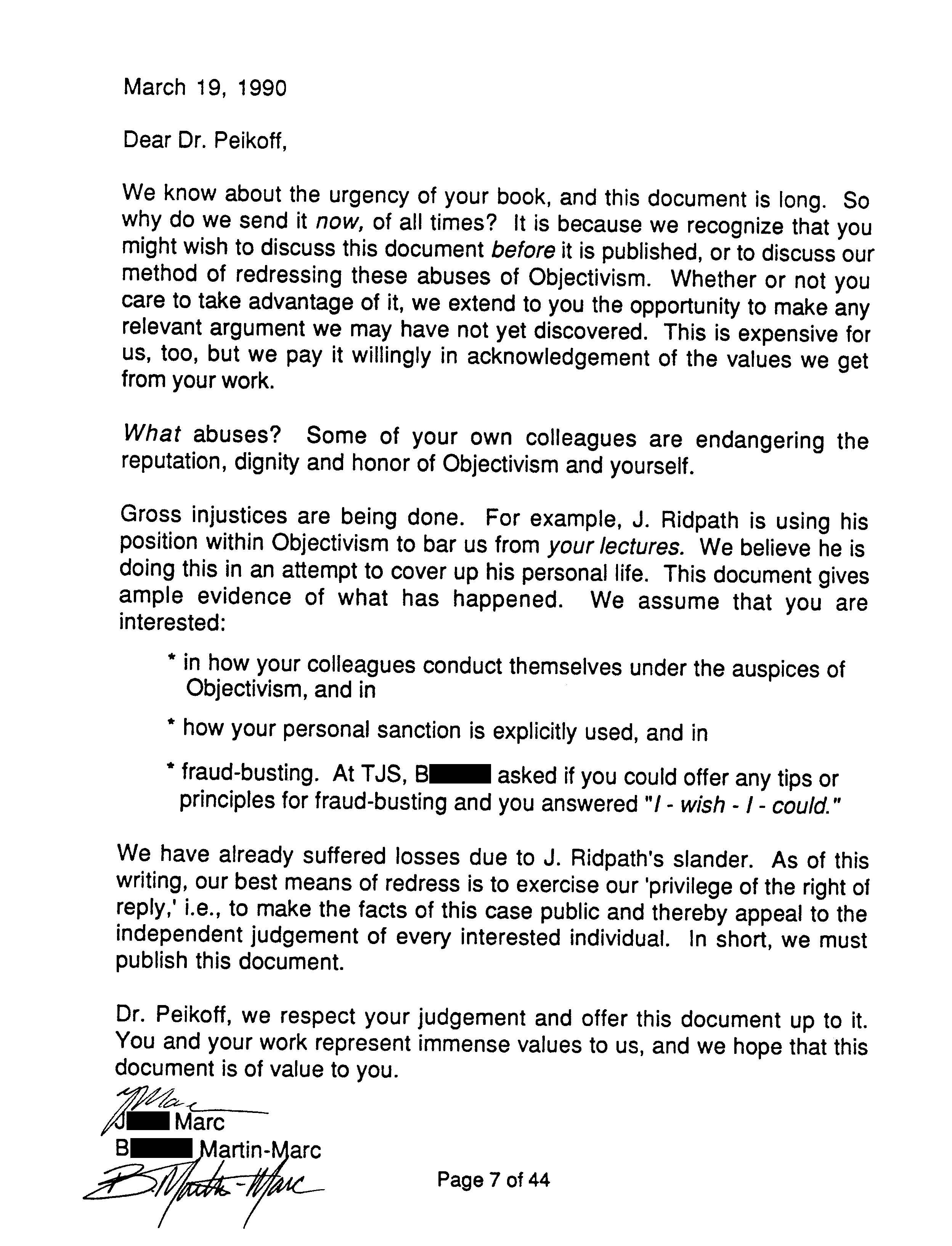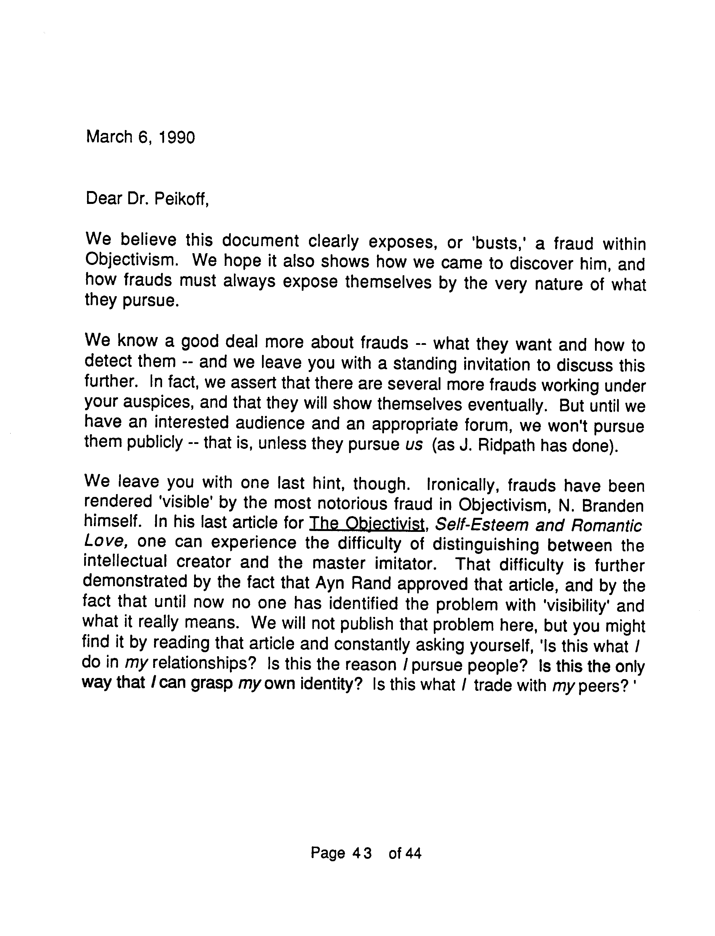 Another reason the Marcs wrote OTIPOJ: it was a chance, they believed their last, to try to educate Peikoff about a type of fraud described at the end of OTIPOJ. * An earlier attempt is reprinted on pages 41 and 42.