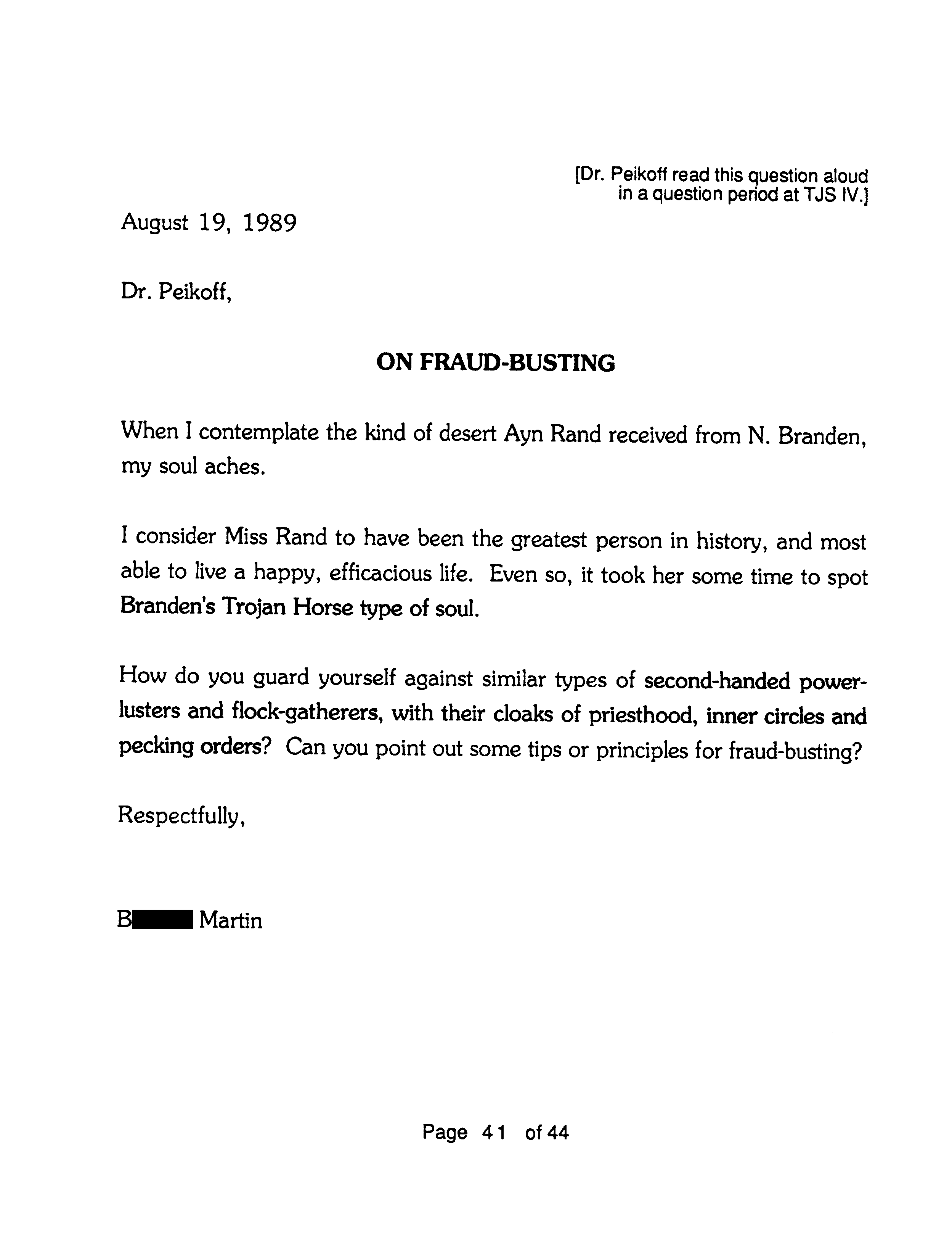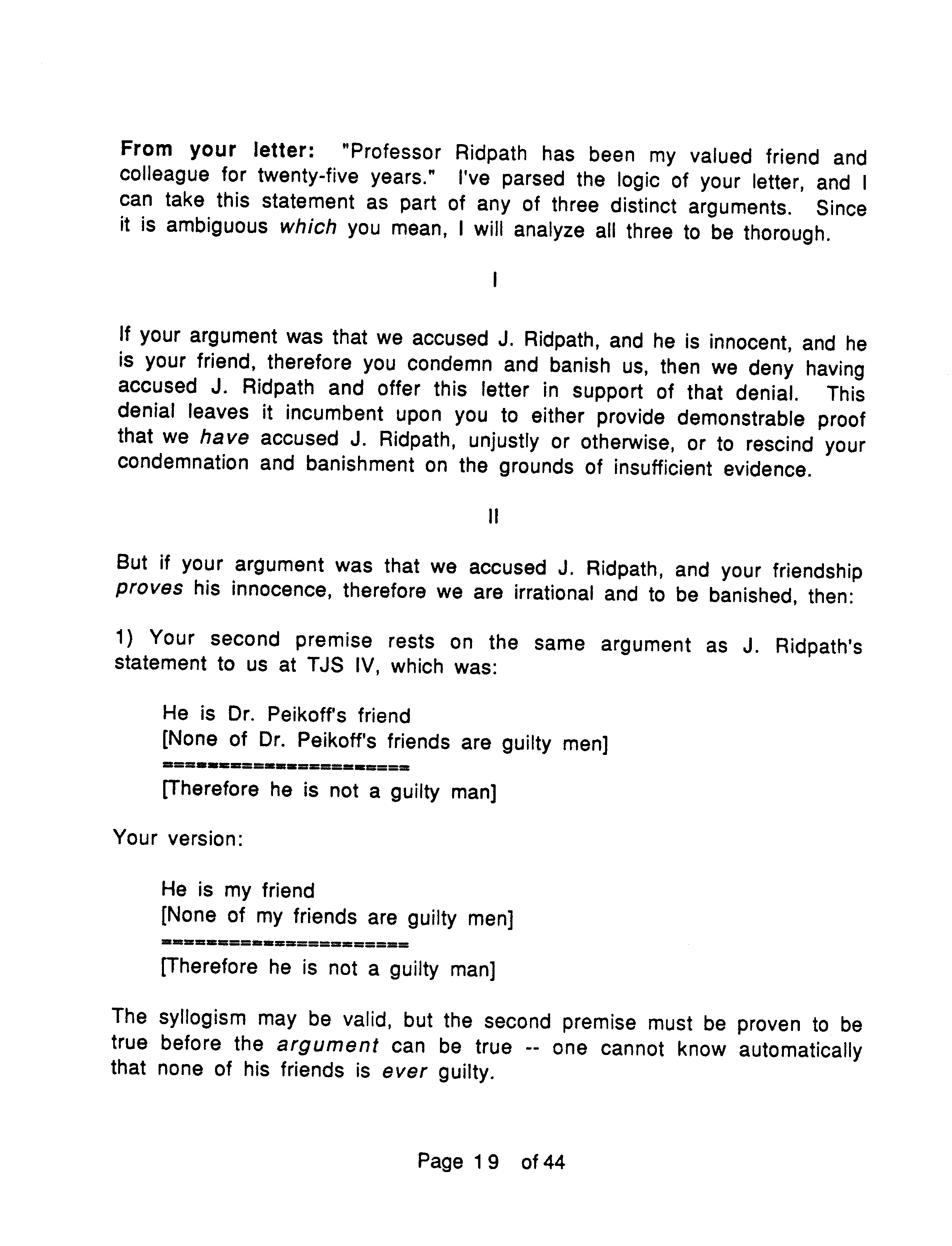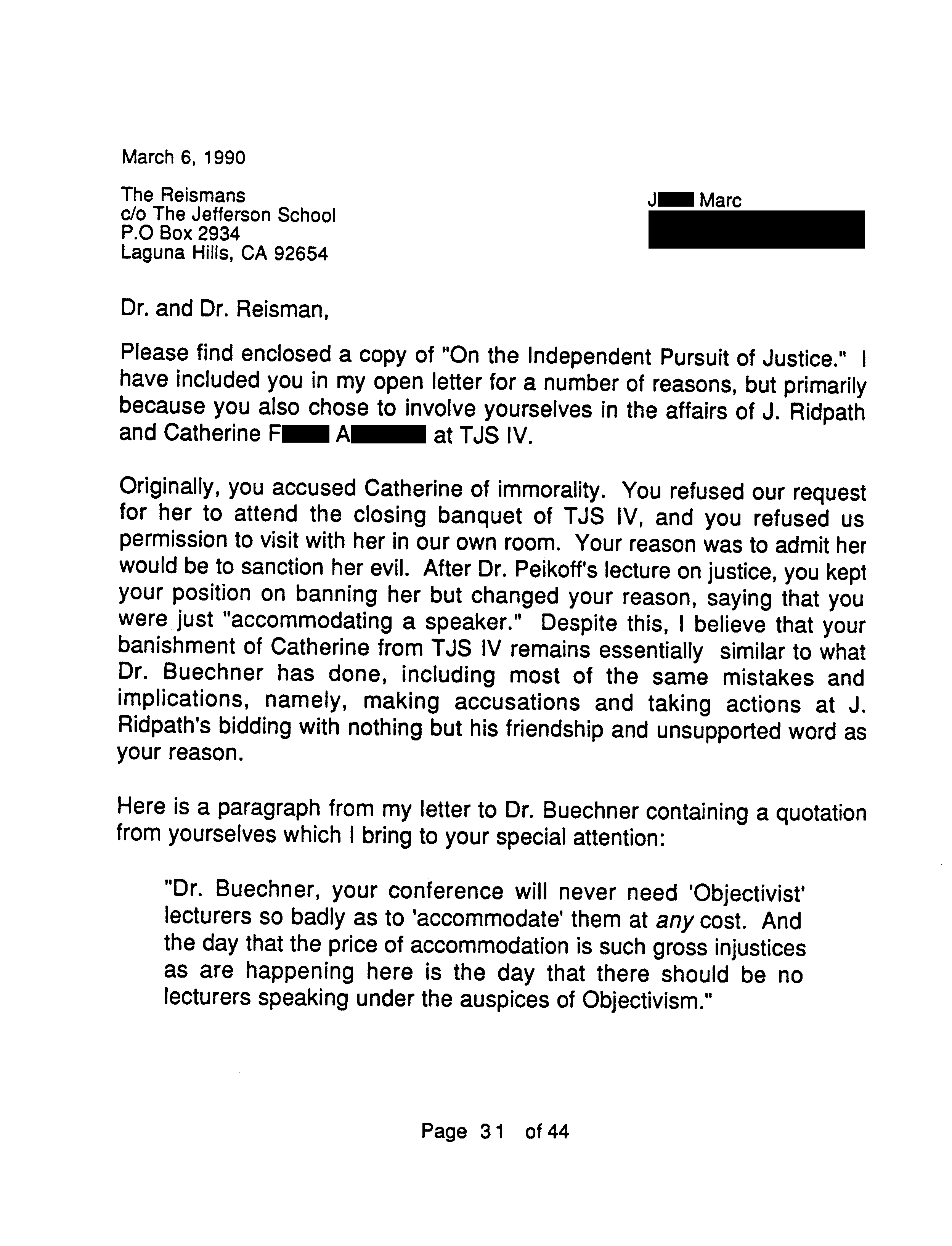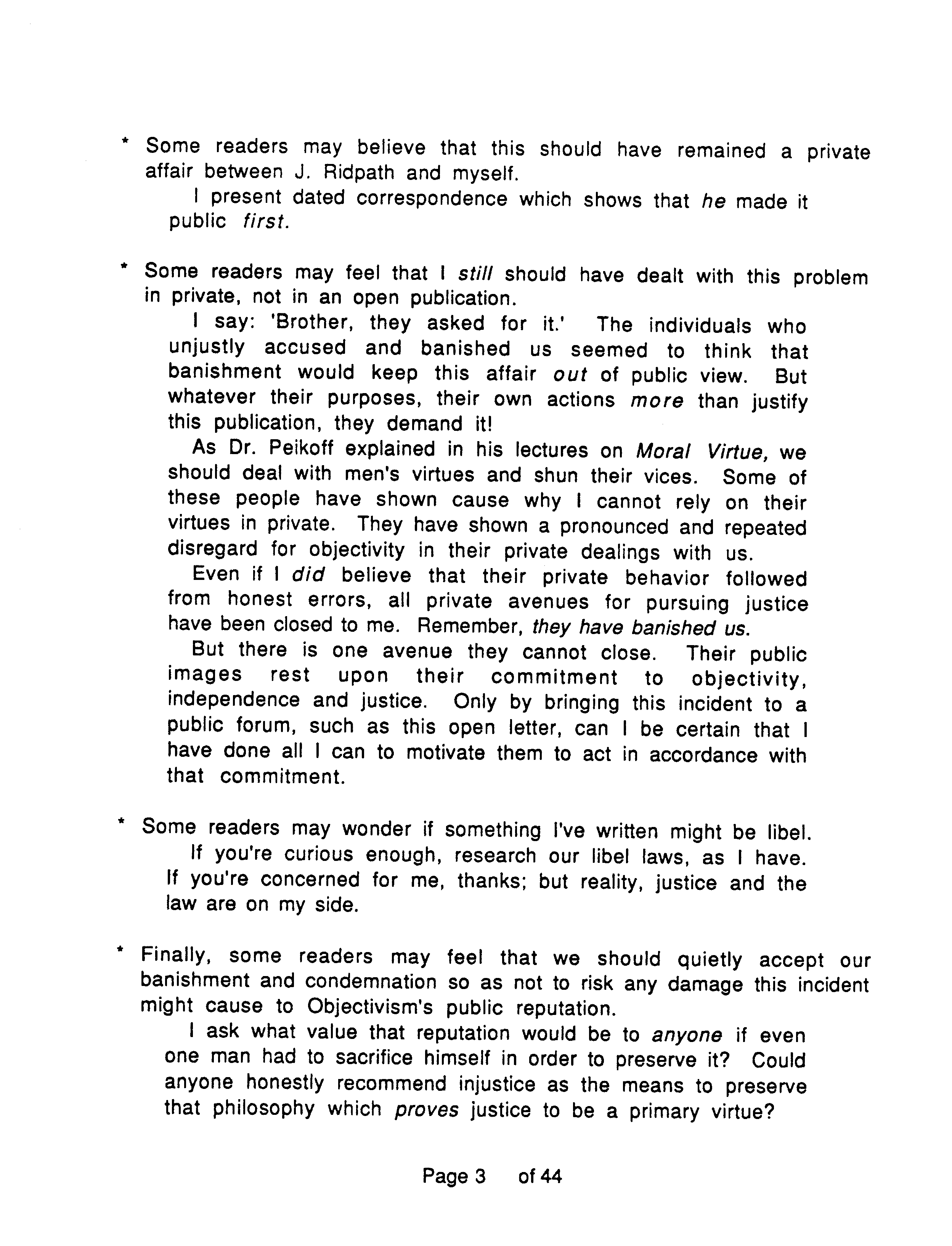 Another reason the Marcs wrote OTIPOJ: it was a chance, they believed their last, to try to educate Peikoff about a type of fraud described at the end of OTIPOJ. * An earlier attempt is reprinted on pages 41 and 42.