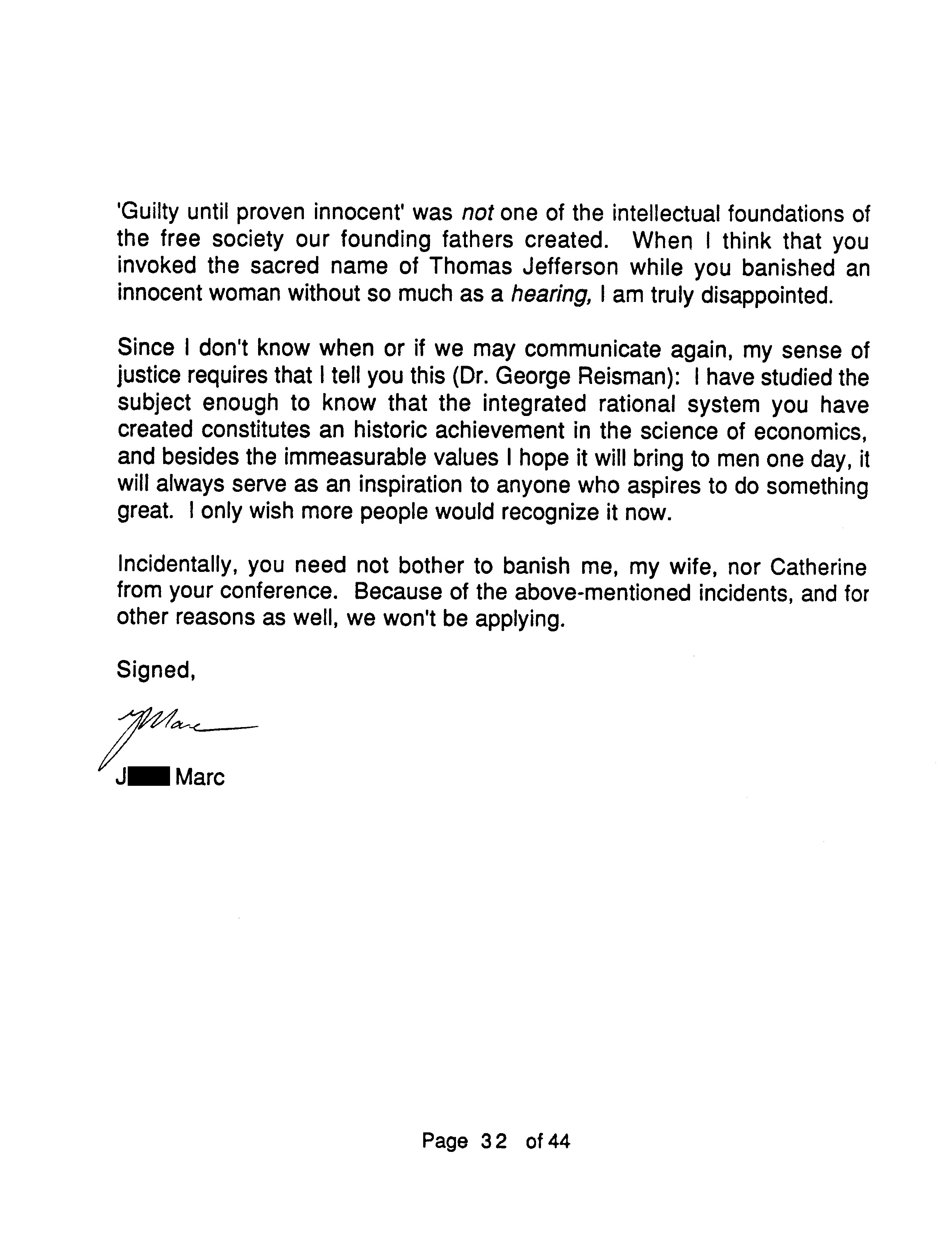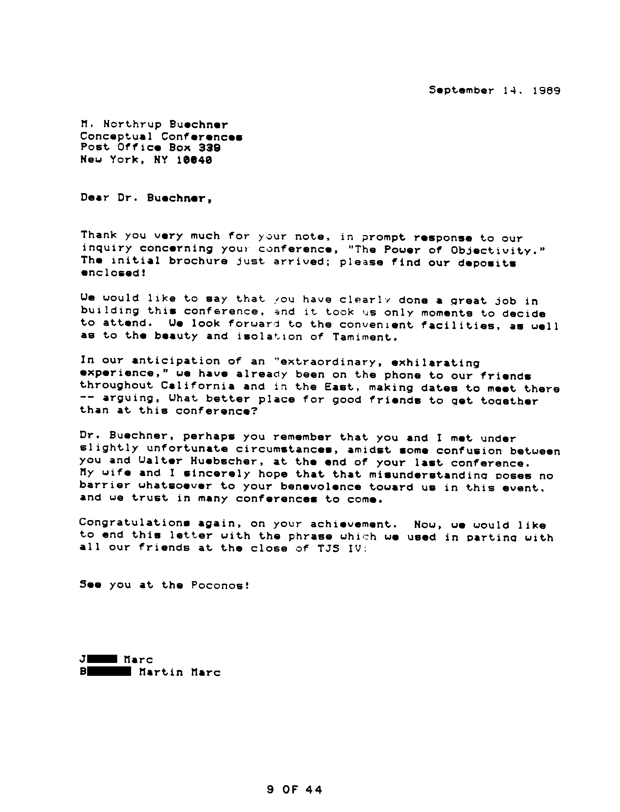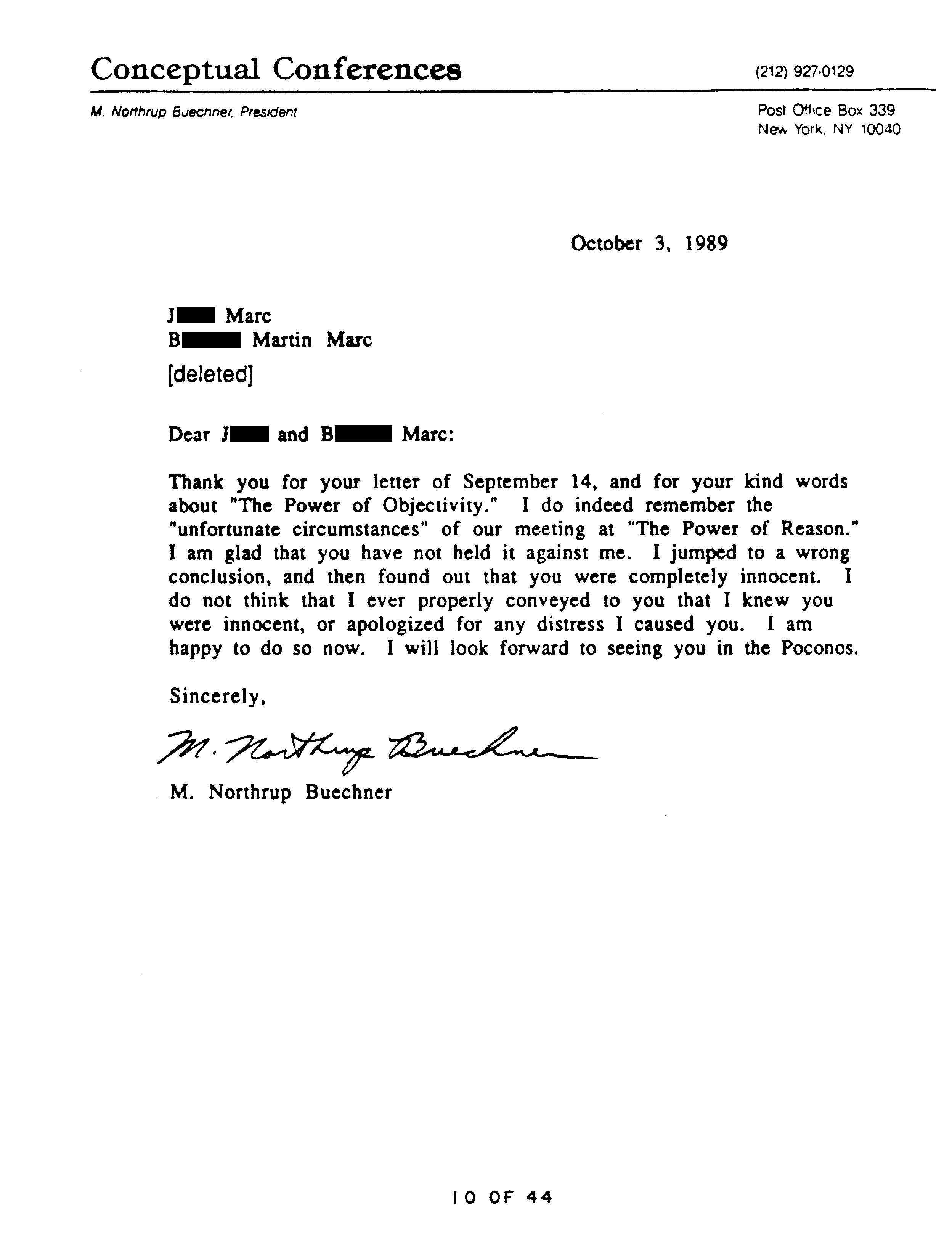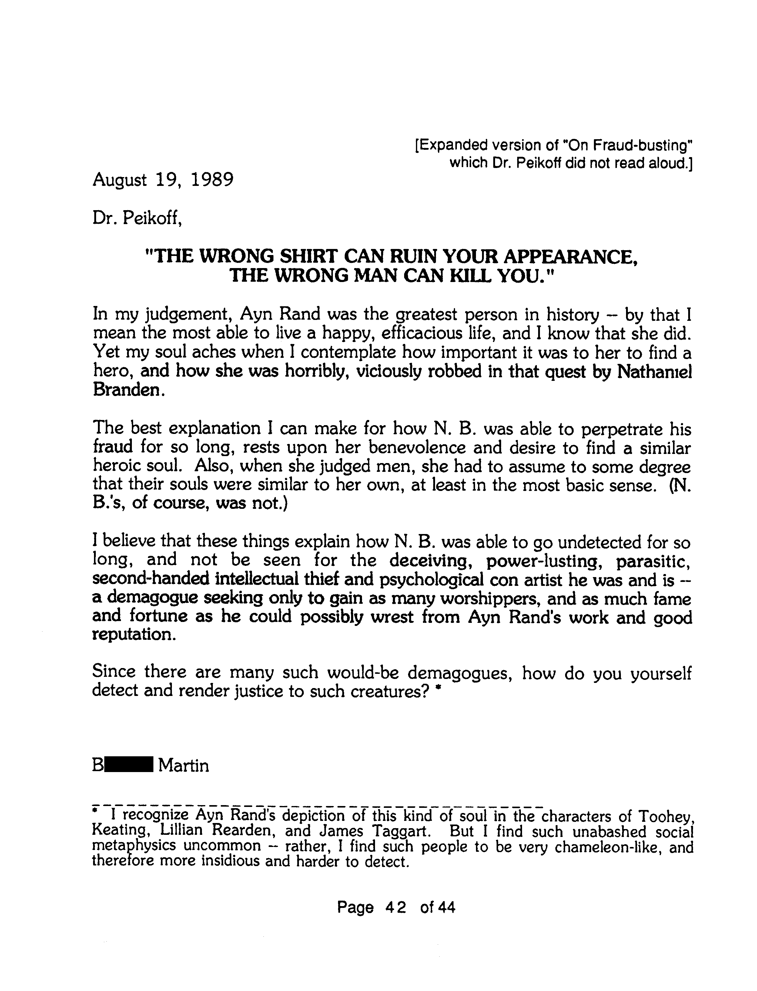Another reason the Marcs wrote OTIPOJ: it was a chance, they believed their last, to try to educate Peikoff about a type of fraud described at the end of OTIPOJ. * An earlier attempt is reprinted on pages 41 and 42.