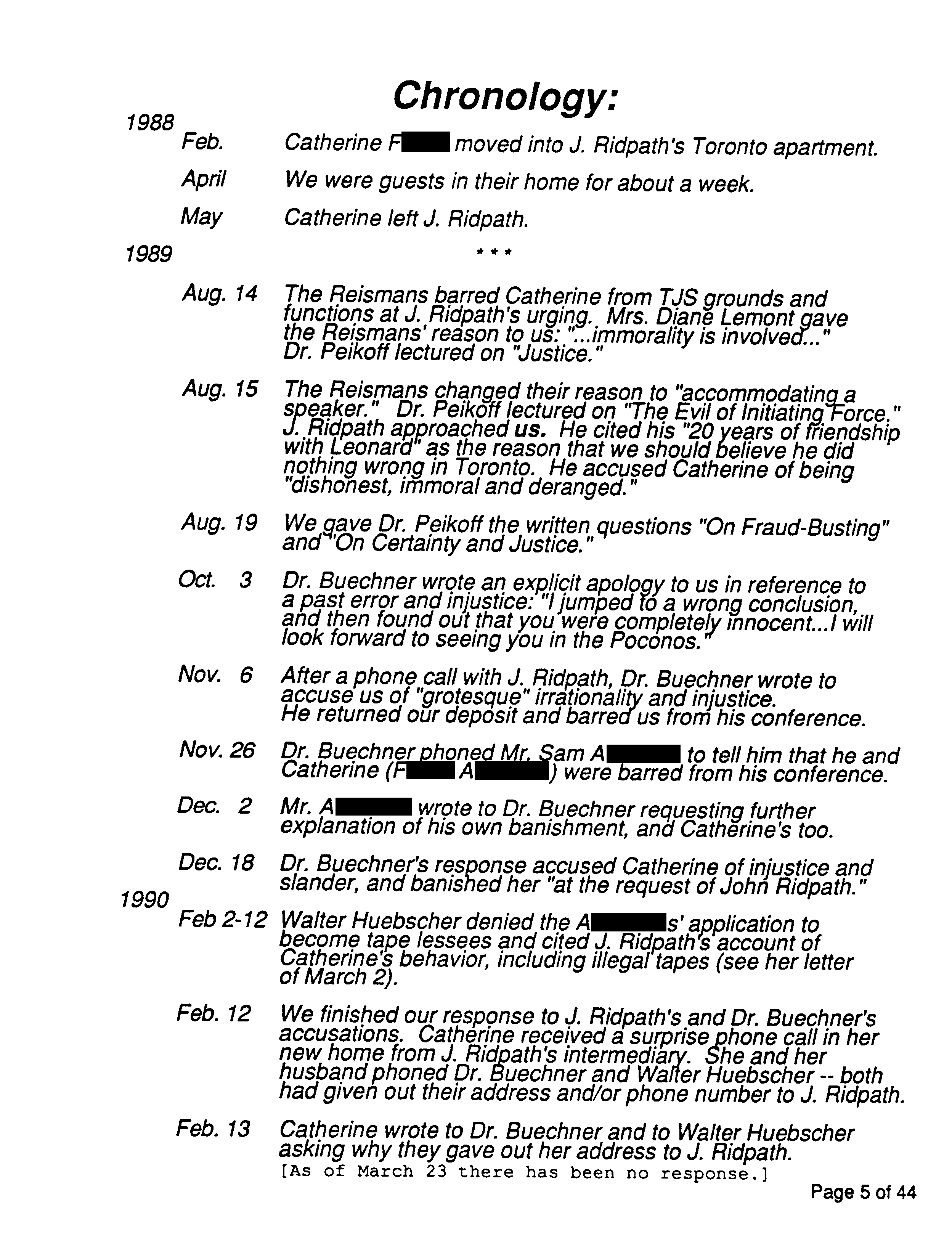 Three times they tried to bring the document to his attention. Twice through his secretary (by mail March 7 and, after a phone call, by fax March 16 * ), in both instances she declined to pass it on to Peikoff. Then once through his wife (by FedEx * March 19), she did not reply. Making OTIPOJ public – the mass mailing on or soon after March 23 – was their last resort in fighting the ban against them as well as any future whisper campaign by Ridpath and his allies. *