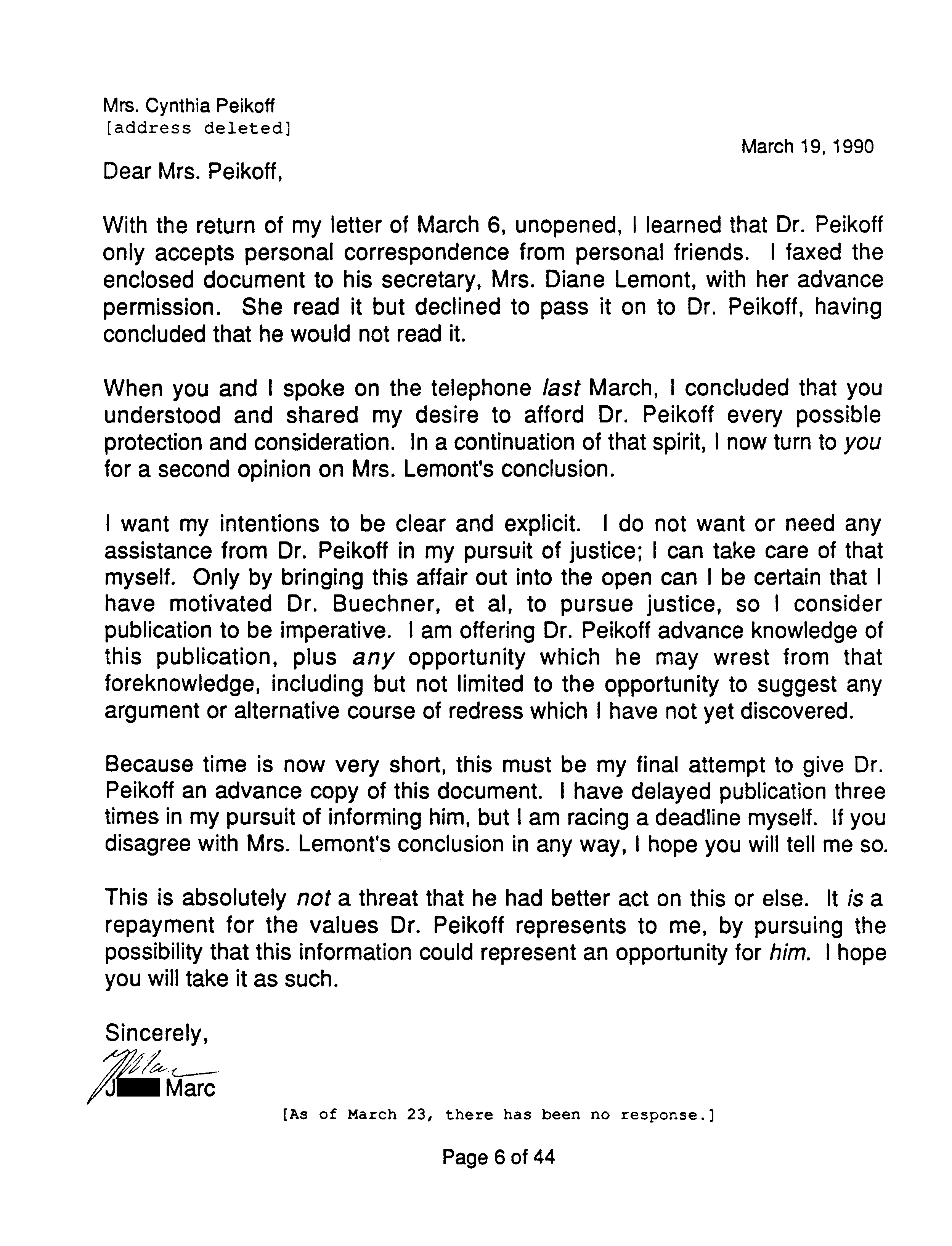 In his letter to Cynthia Peikoff (page 6) J. Marc says he considers publishing OTIPOJ to be “imperative.” Perhaps a less forceful word would have more accurately described his feeling because almost immediately after that he says he wants Peikoff to read OTIPOJ first so he can suggest an “alternative course of redress ... .”
