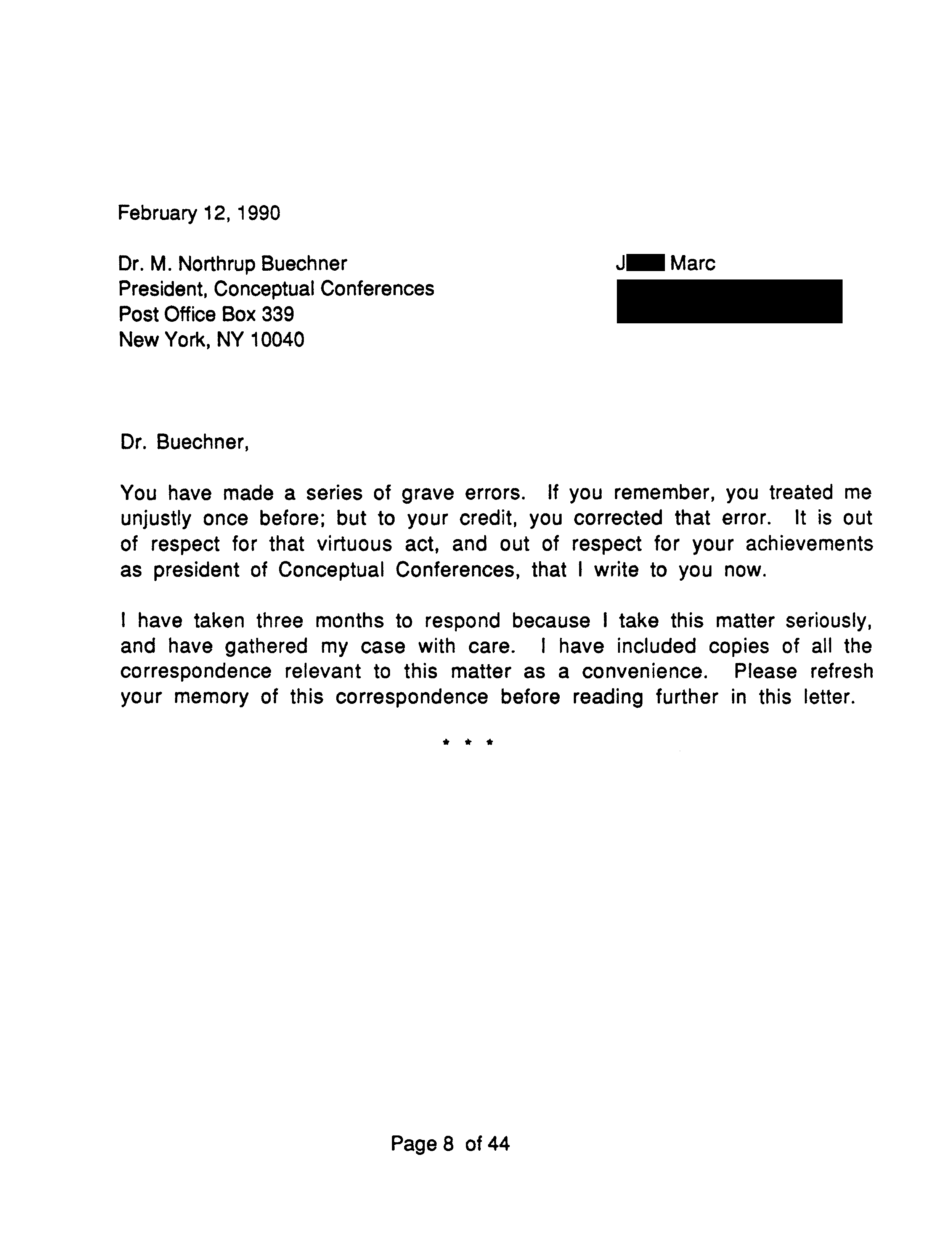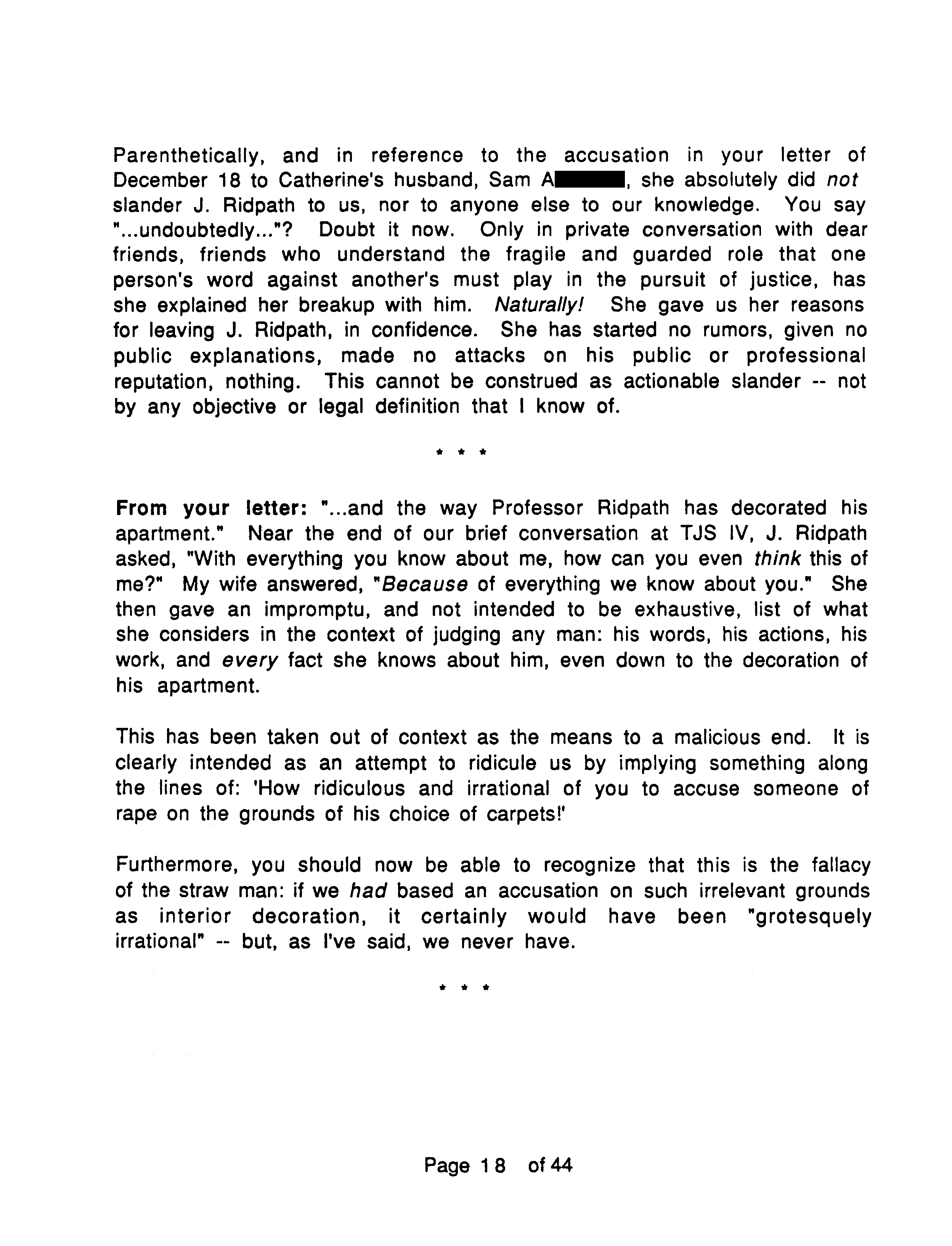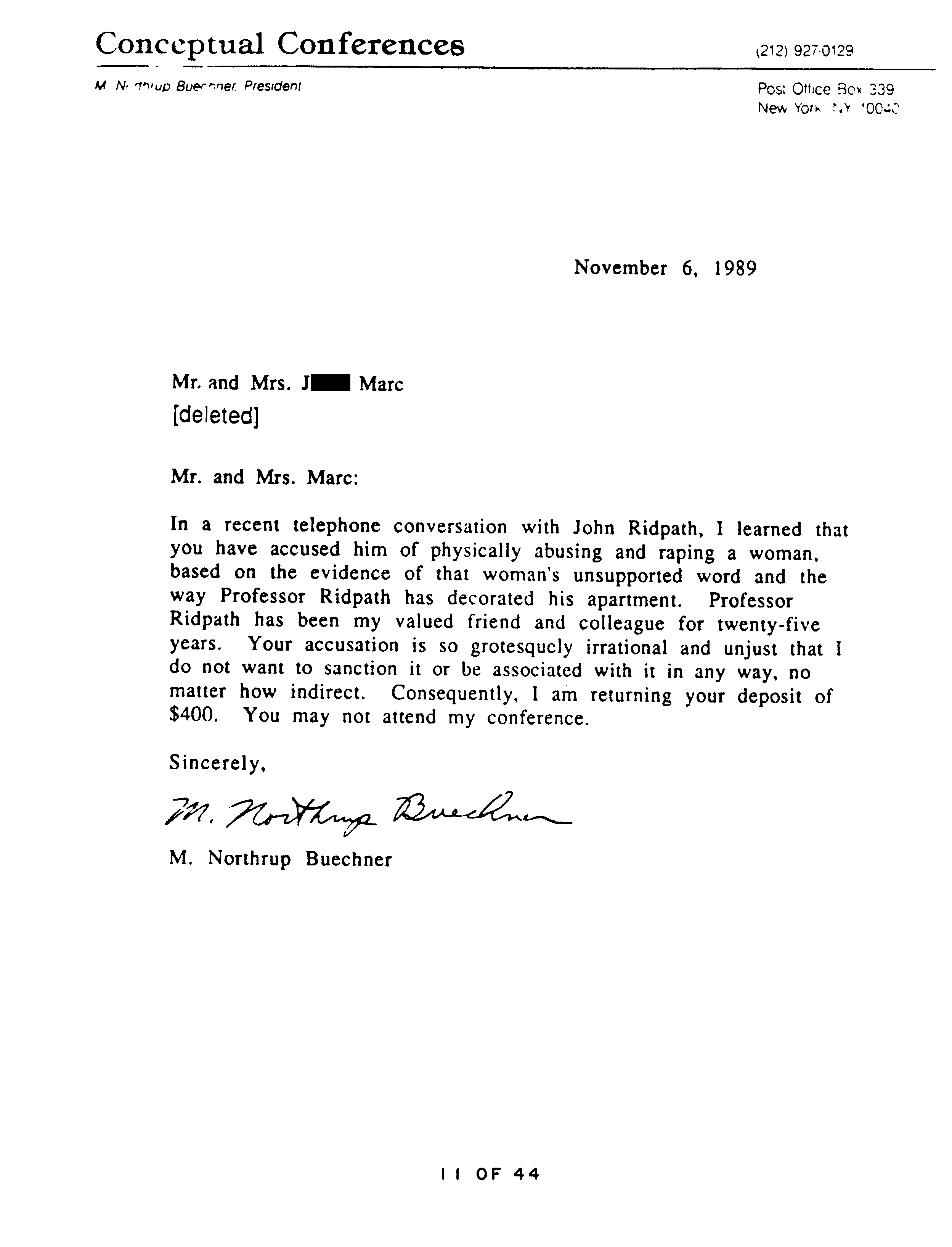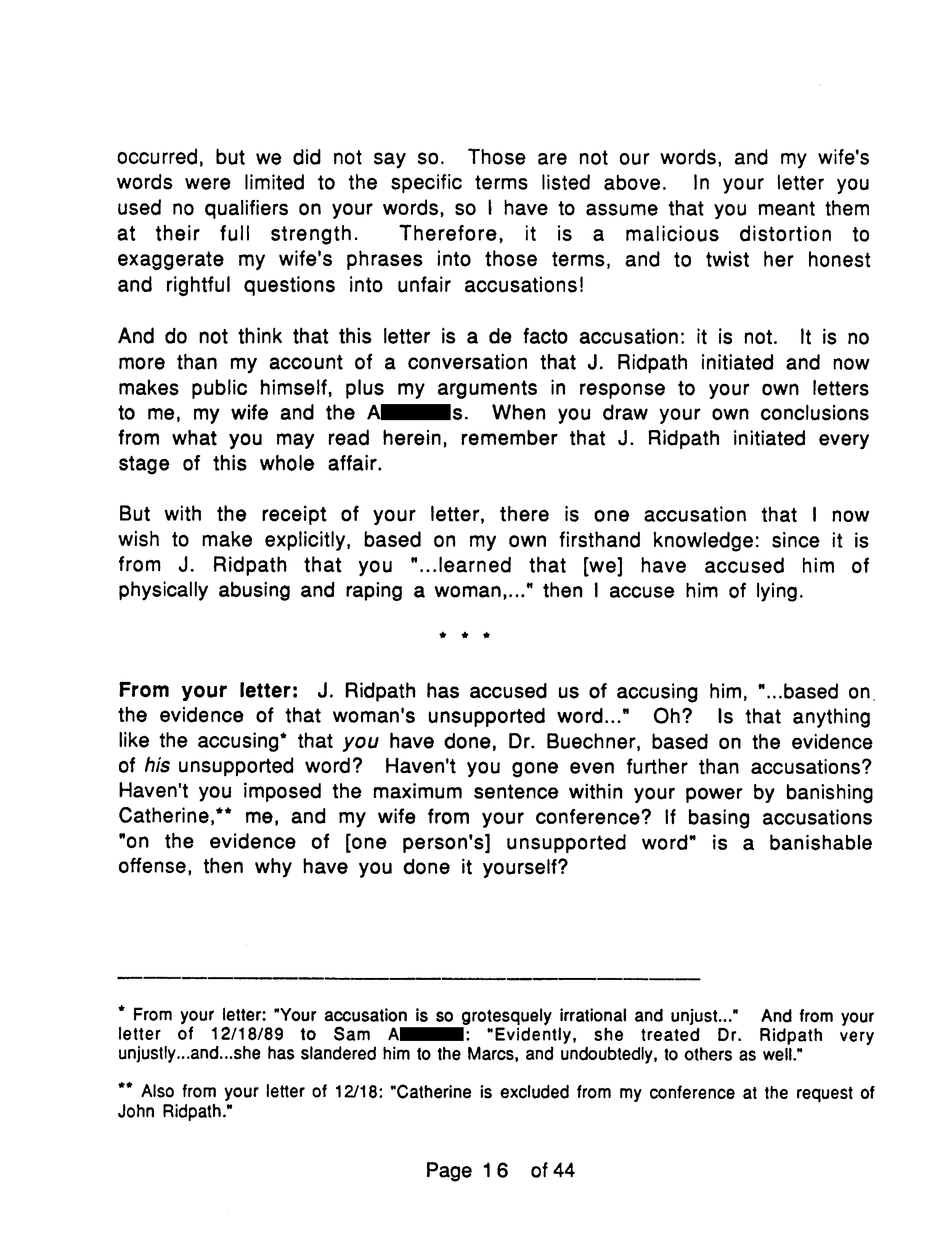 Ridpath had approached J. Marc about Catherine, and J. Marc asked him if he had assaulted her. However Buechner in his letter to J. Marc accuses him of having said Ridpath assaulted Catherine, not just questioned him about it. J. Marc replies: “neither I nor my wife has accused J. Ridpath of anything.” Even though Buechner was mistaken, J. Marc overstates his own case. He makes too nice a distinction between words and what they will be taken to mean.