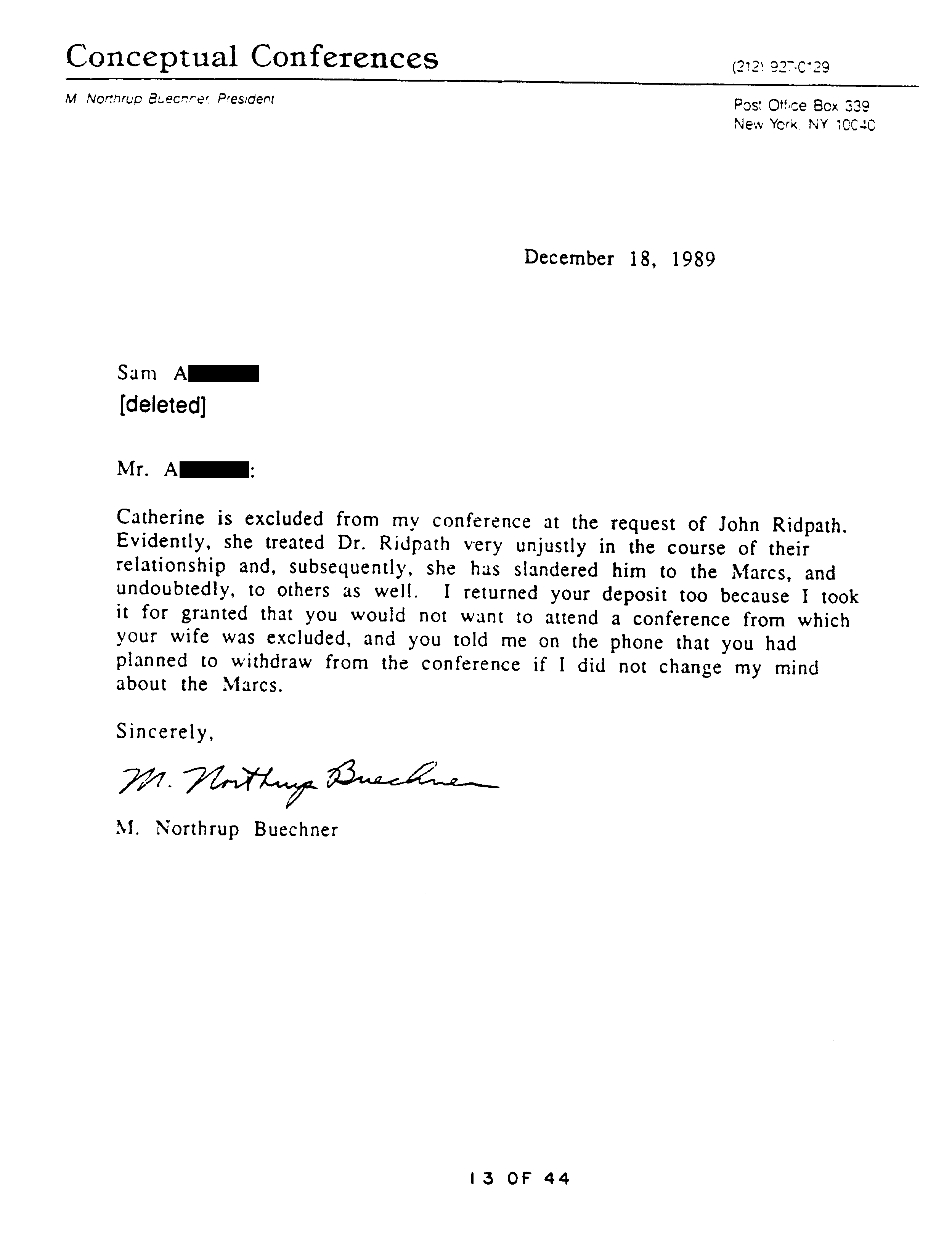 Also telling against Buechner is his giving out confidential information. In the course of business at Conceptual Conferences he knew that Catherine had moved to a new address and what it was. Though he may not have known that Catherine had “filed a criminal complaint” against Ridpath (page 23), he did know that she claimed he had assaulted her. Buechner can reasonably be expected to know that she was afraid of Ridpath. (Even if he thought Catherine was lying he should not have taken a chance in such an important matter.) Yet when Ridpath asked Buechner for her new address, he had no problem furnishing it (page 29). Even without the assault allegations, divulging personal information to a third party would have been a breach of confidence, with the allegations it is beyond clueless.