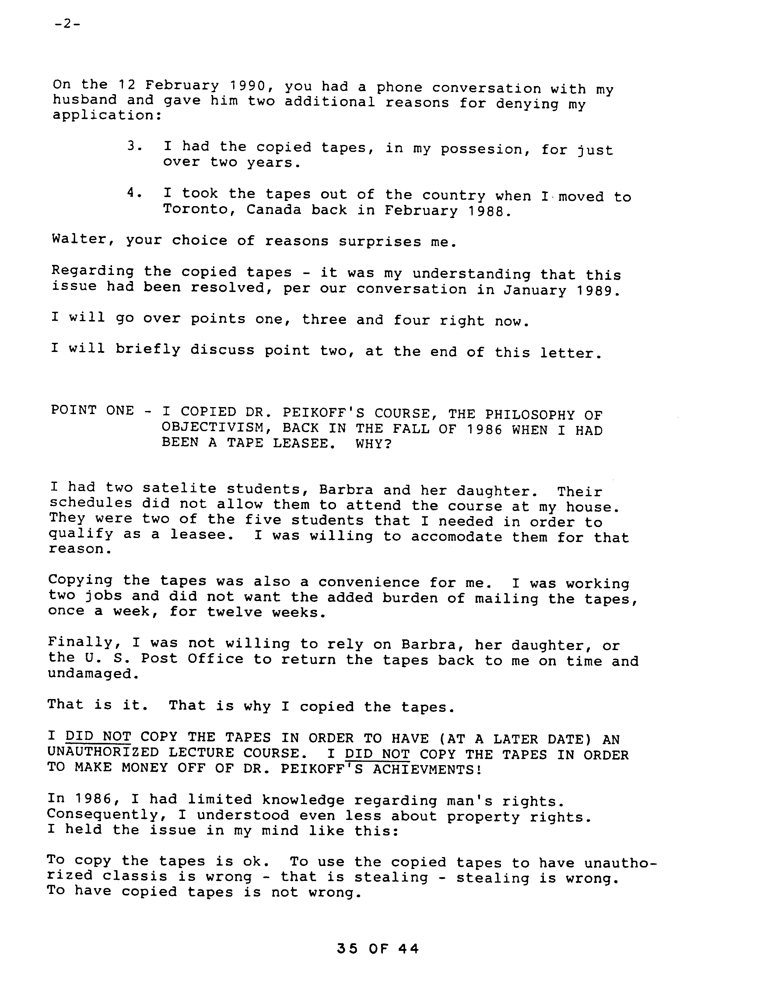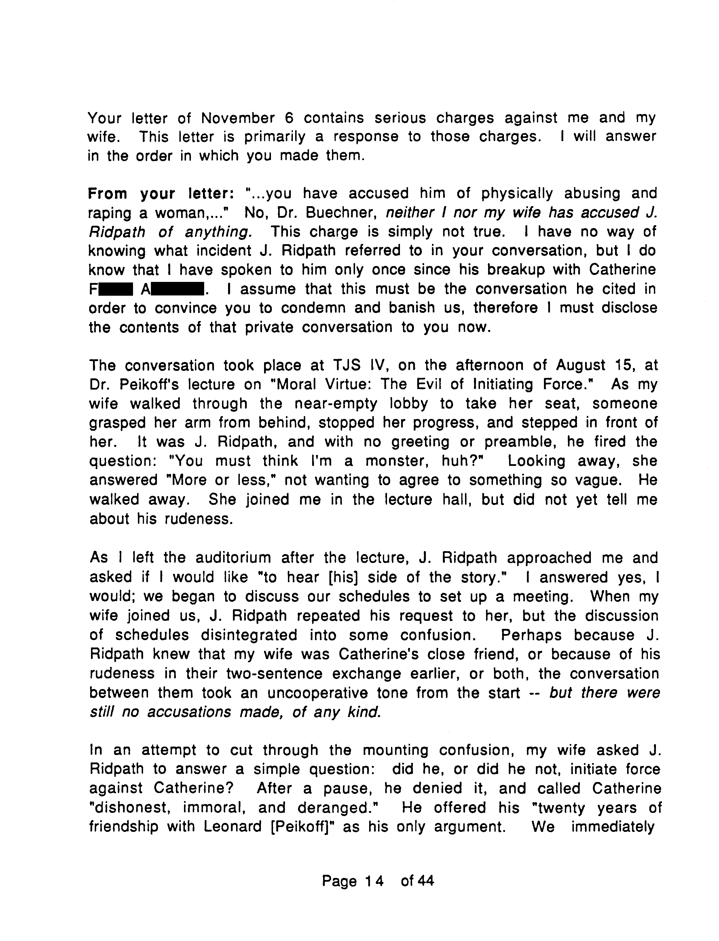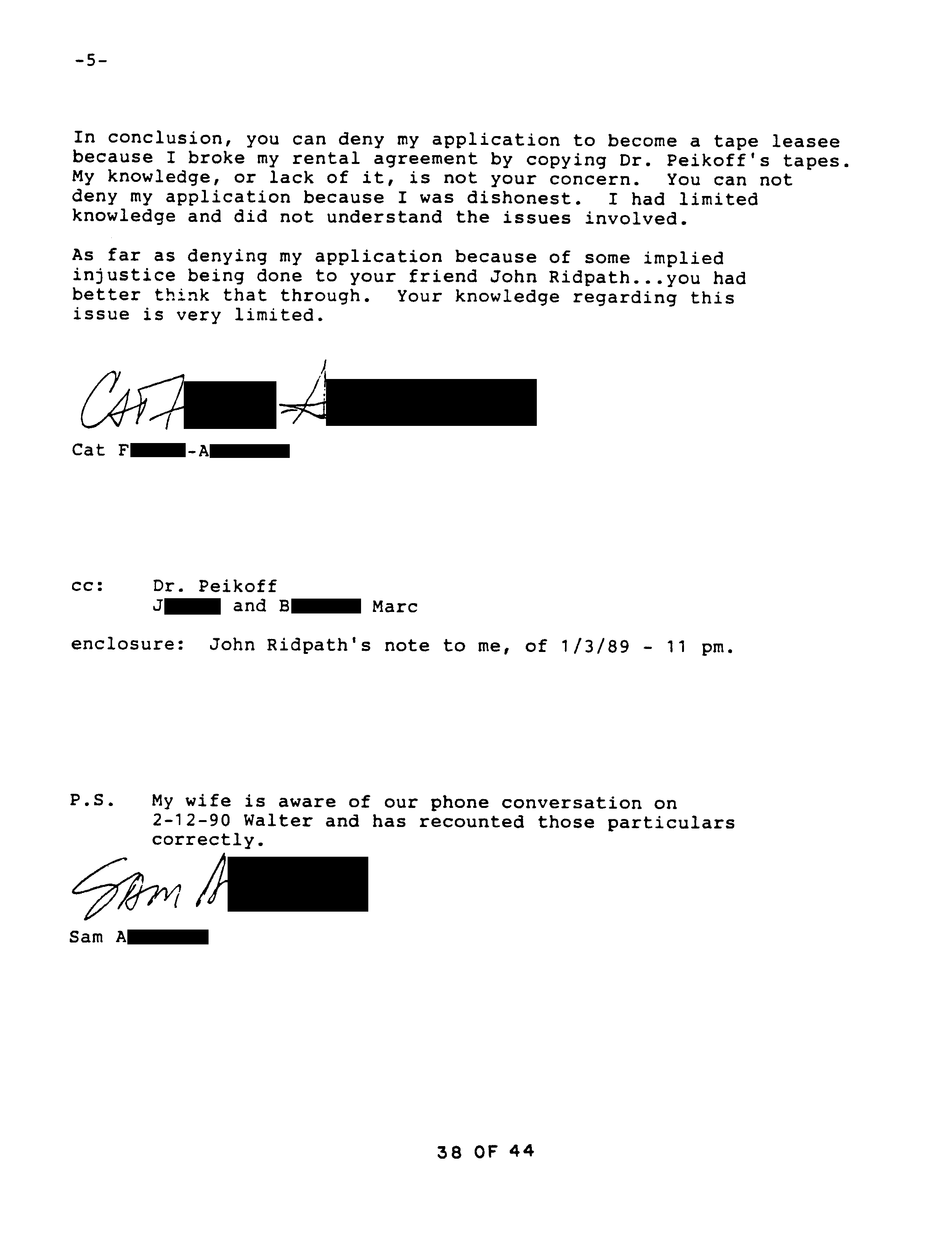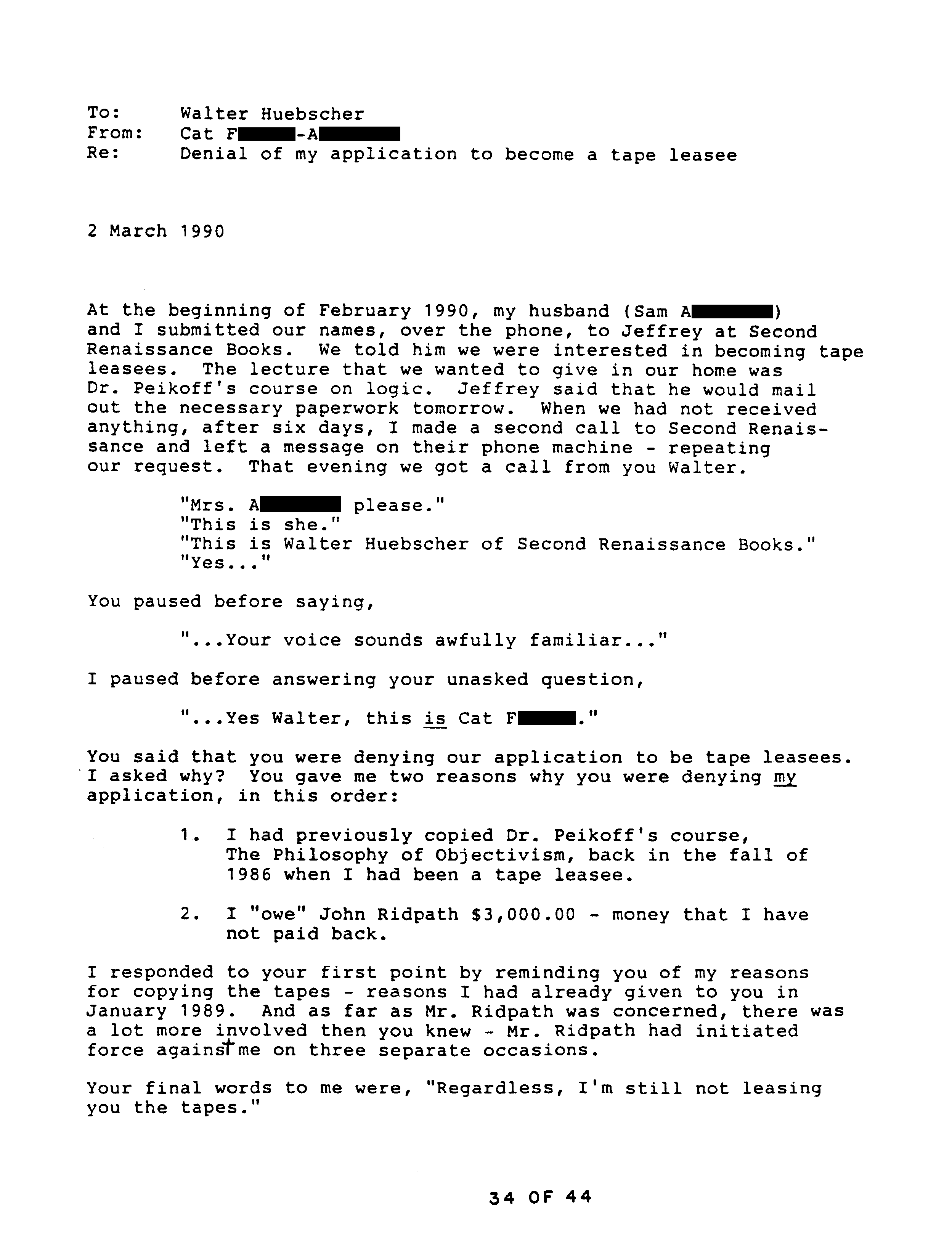 After Catherine got together with Ridpath he knew of the copy and made no complaint, at one point even lending it to his son, returned nine months later. After Catherine broke with Ridpath he said nothing about the copy to Second Renaissance Books. According to Catherine, well after they had broken up Ridpath attacked her, and she told the Marcs about it. Only then did Ridpath inform on Catherine, telling the manager of Second Renaissance Books, Huebscher, that she possessed a copy of Peikoff’s tapes. Catherine then explained to Huebscher what she had done. Catherine repeats her explanation, which by that time she realizes is not a legitimate excuse, in a subsequent letter to Huebscher, starting on page 34.