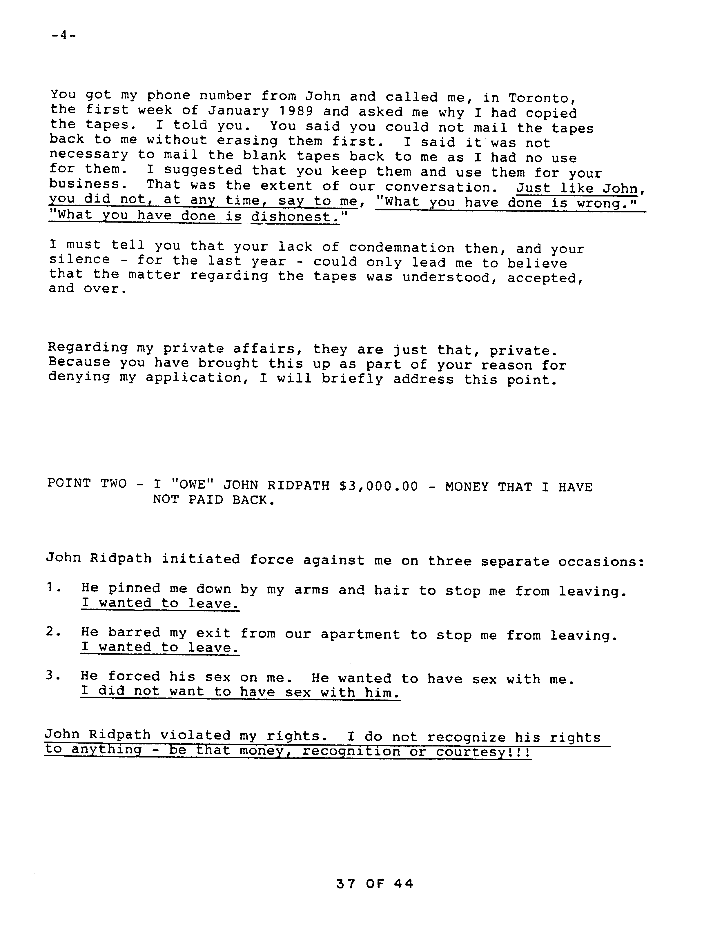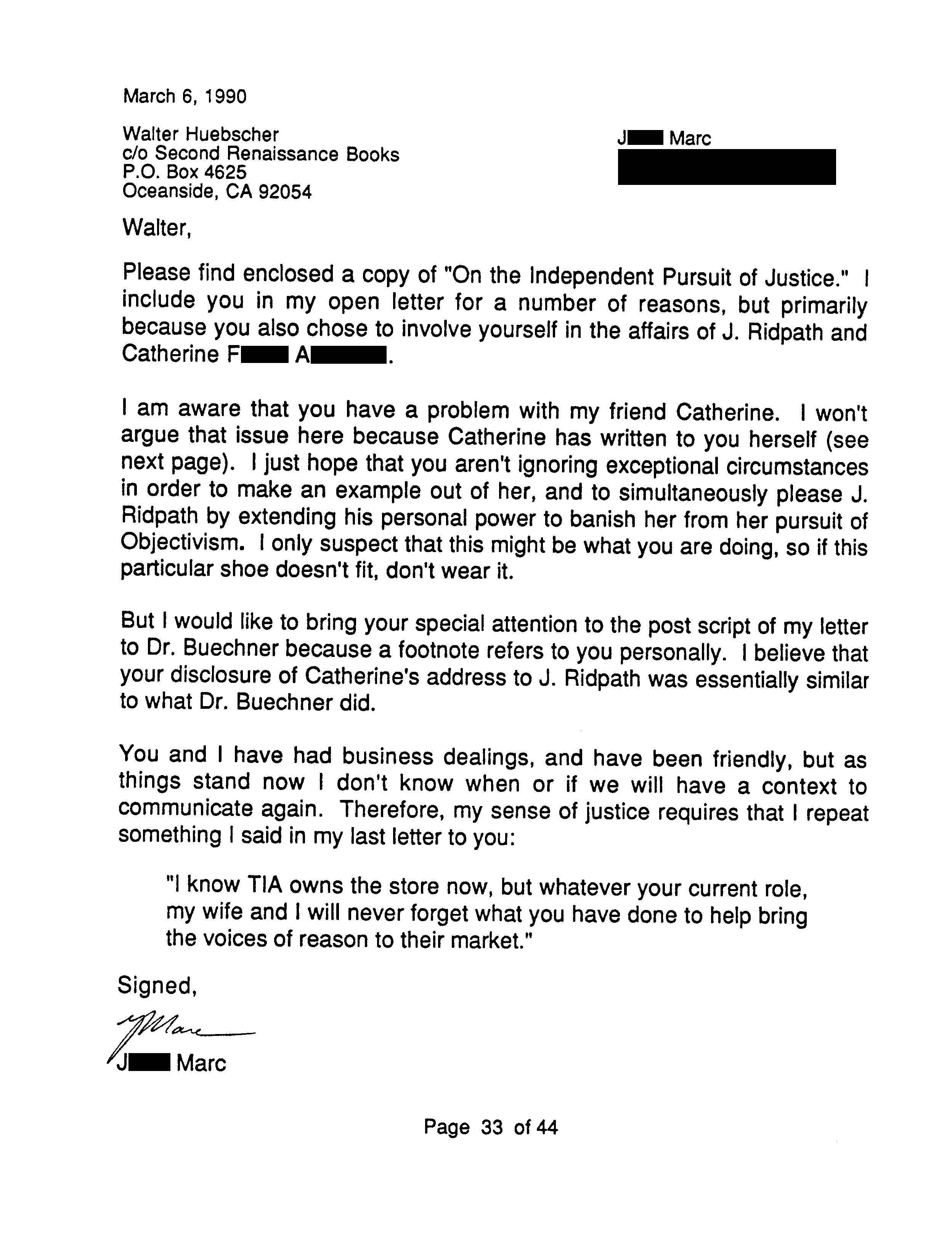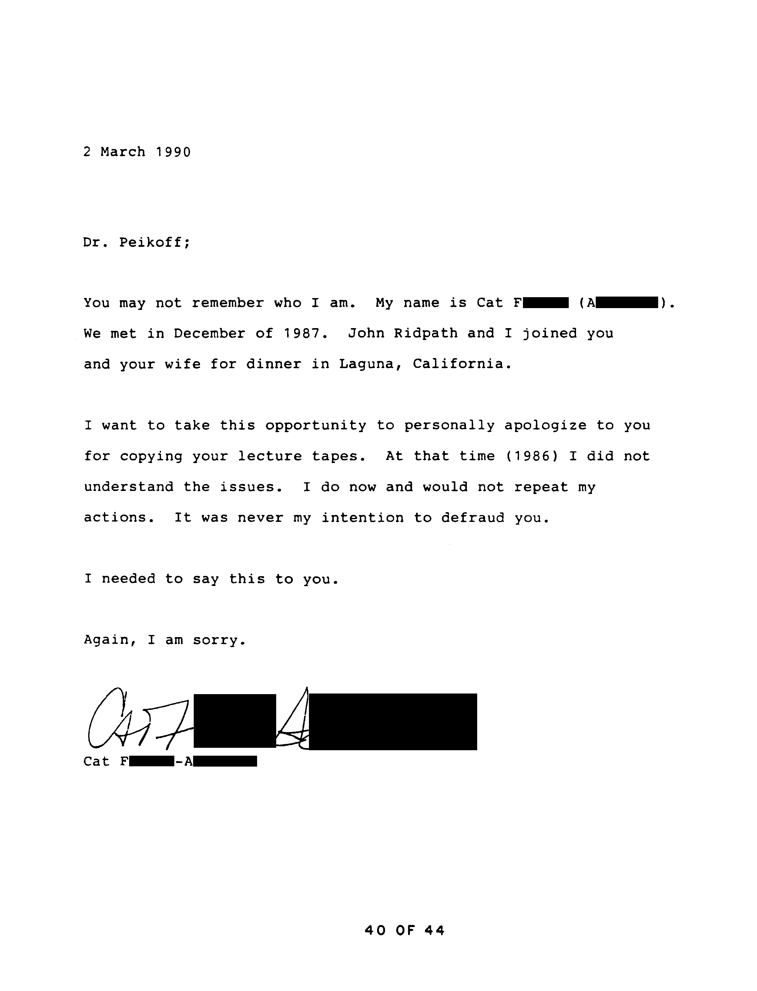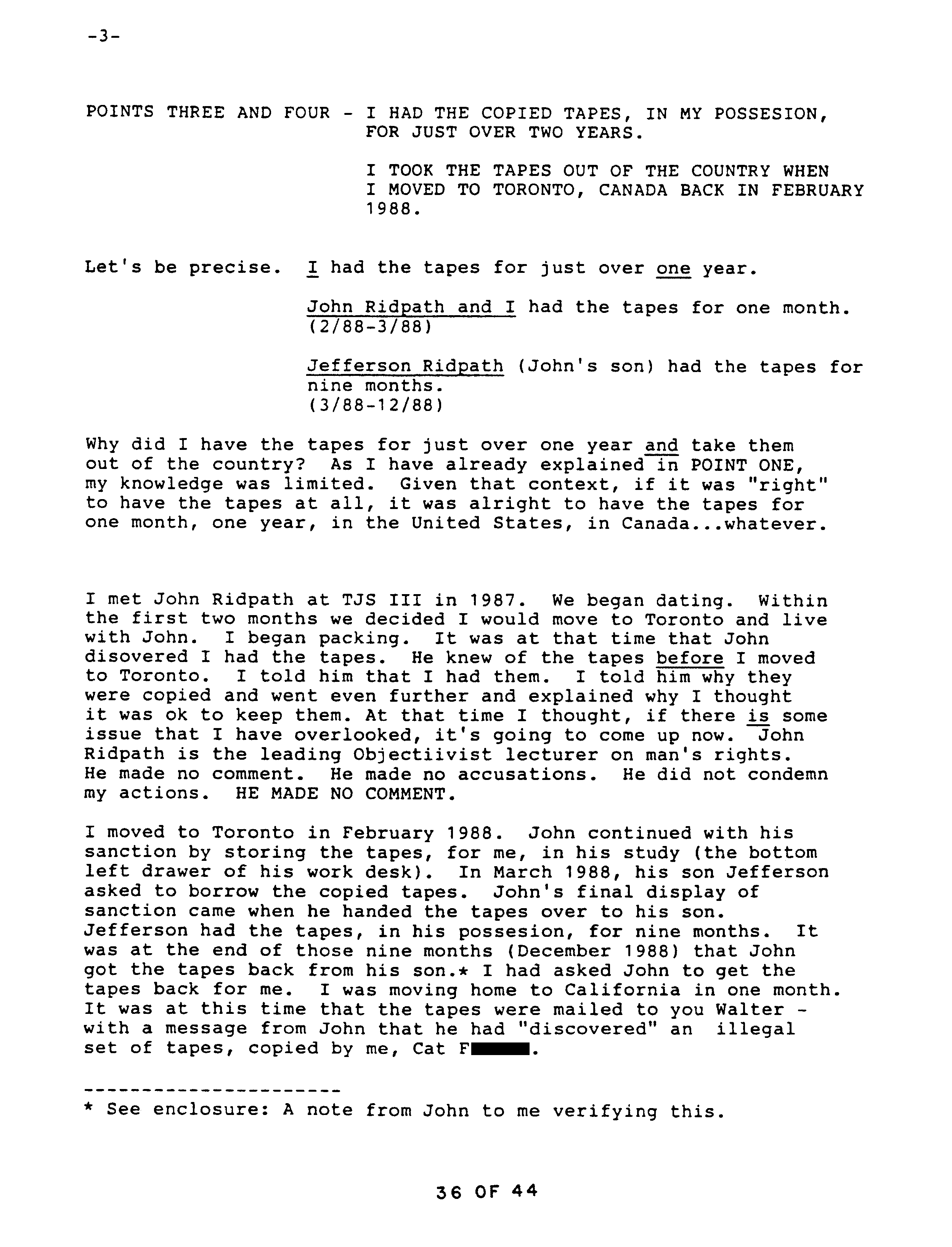 After Catherine got together with Ridpath he knew of the copy and made no complaint, at one point even lending it to his son, returned nine months later. After Catherine broke with Ridpath he said nothing about the copy to Second Renaissance Books. According to Catherine, well after they had broken up Ridpath attacked her, and she told the Marcs about it. Only then did Ridpath inform on Catherine, telling the manager of Second Renaissance Books, Huebscher, that she possessed a copy of Peikoff’s tapes. Catherine then explained to Huebscher what she had done. Catherine repeats her explanation, which by that time she realizes is not a legitimate excuse, in a subsequent letter to Huebscher, starting on page 34.