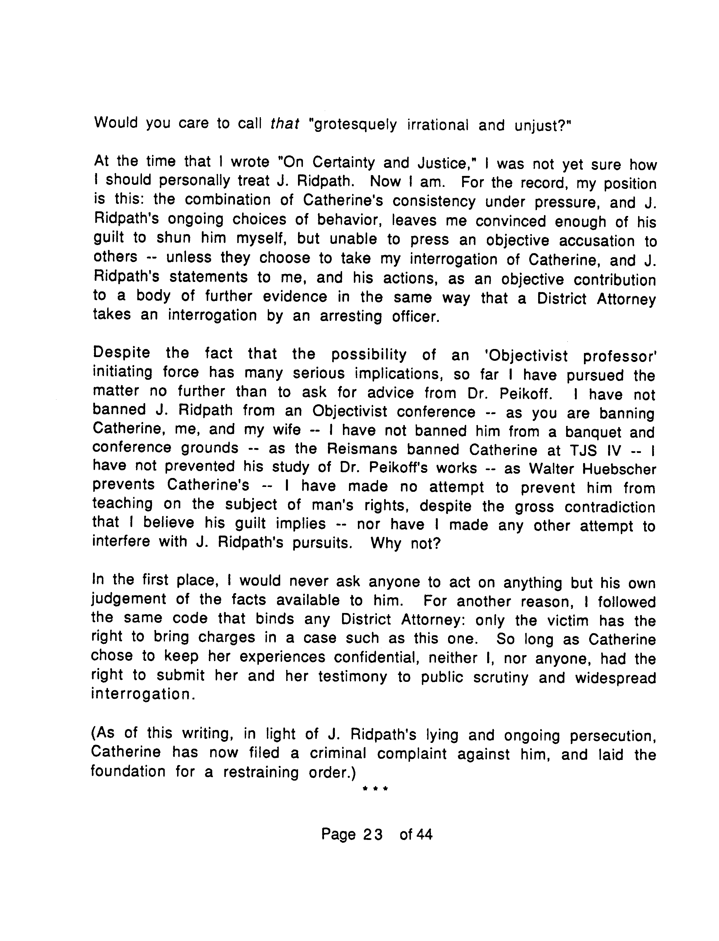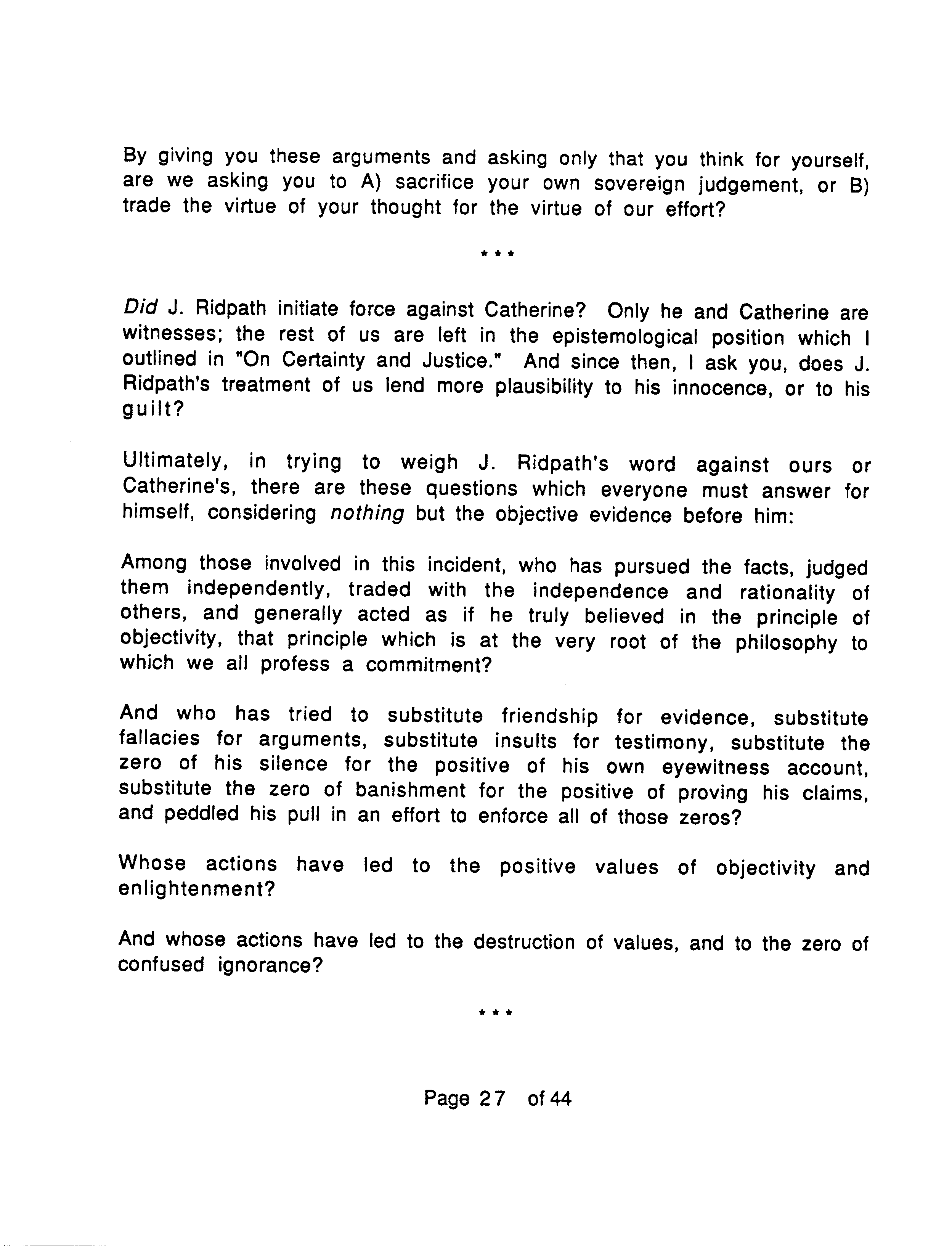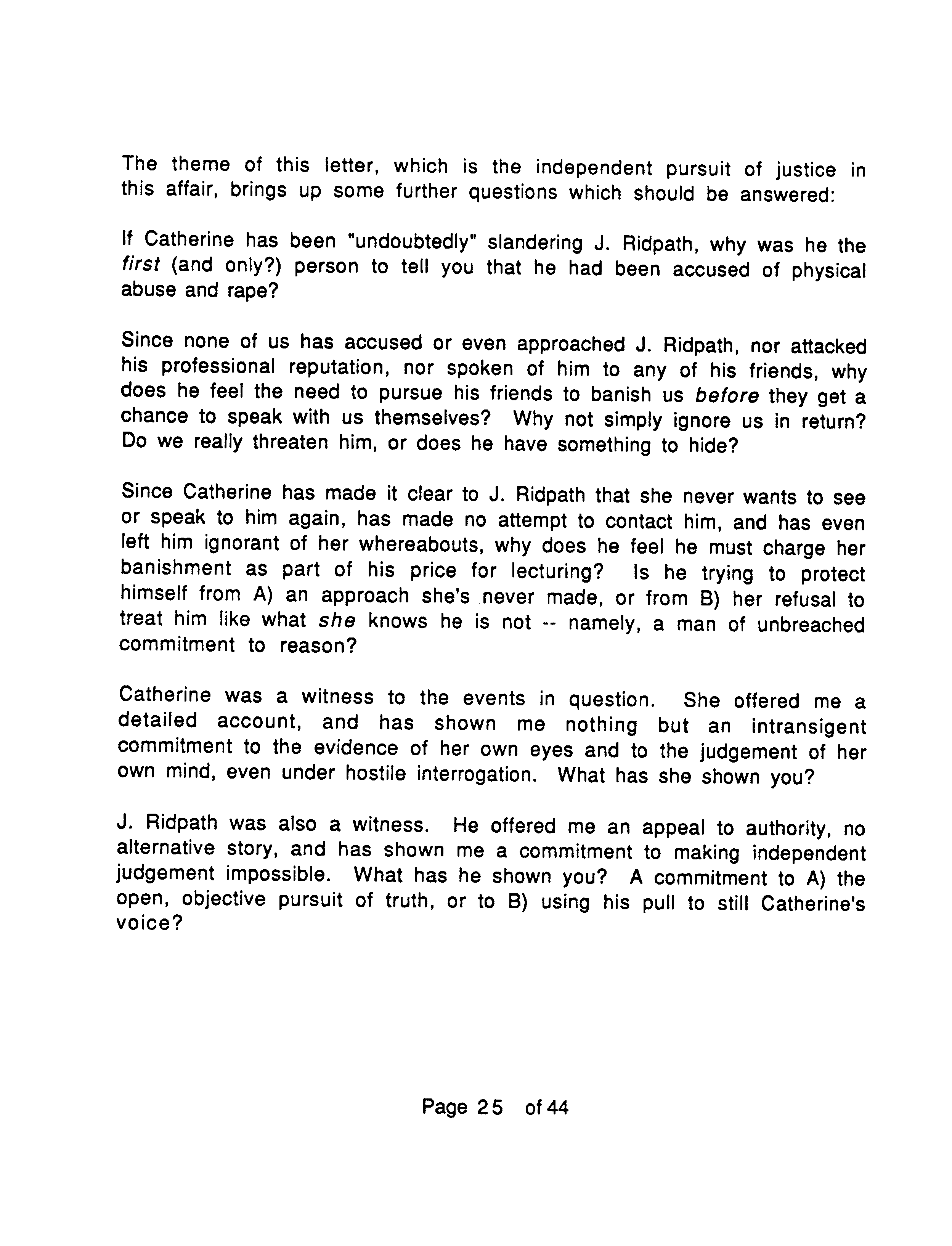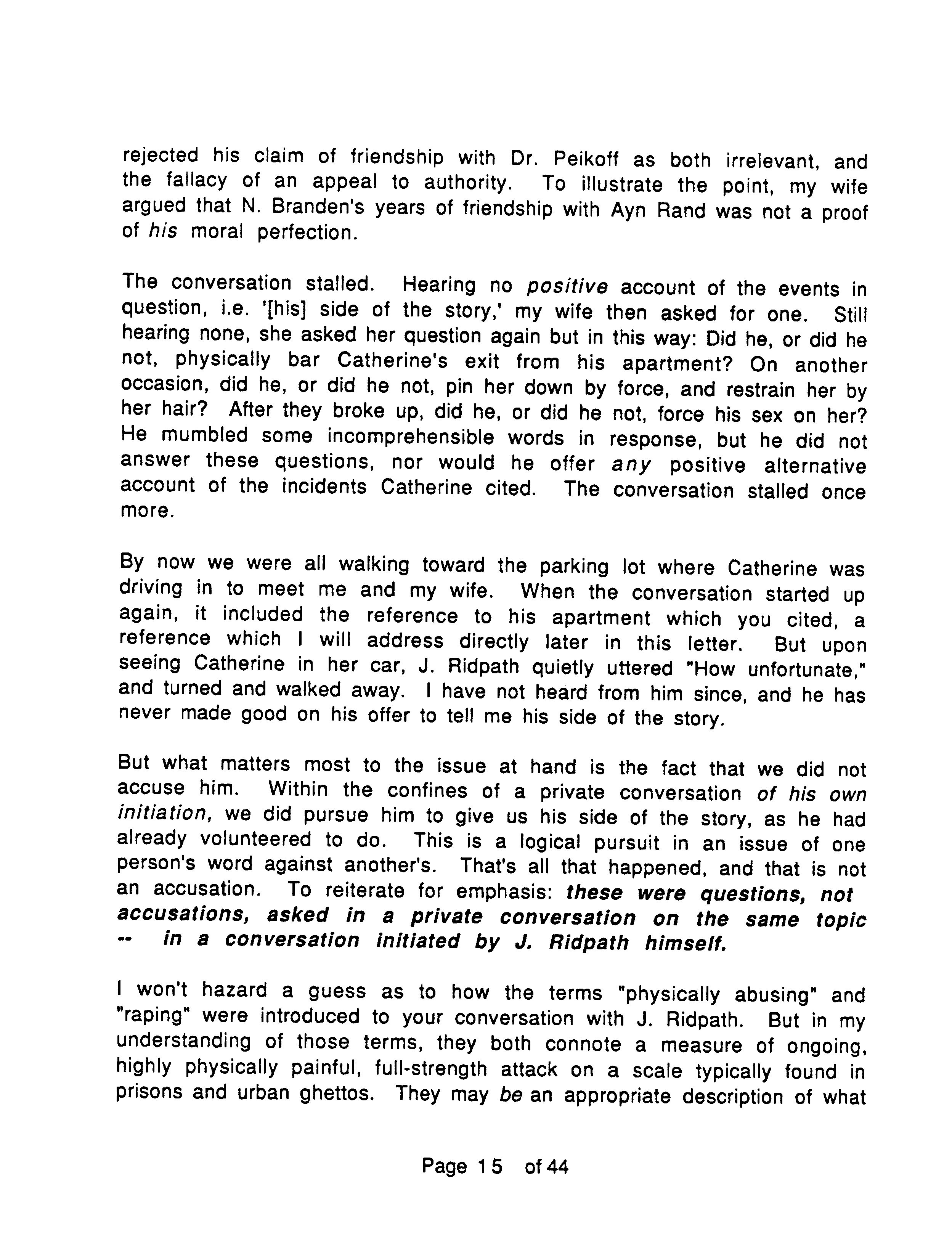 To repeat, J. Marc places the emphasis of OTIPOJ on the fact that Ridpath manipulated leading Objectivists against him, his wife and Catherine, rather than on any assault Ridpath might have committed against Catherine. On the latter point he makes no claim either way, saying that only Ridpath and Catherine know what happened.