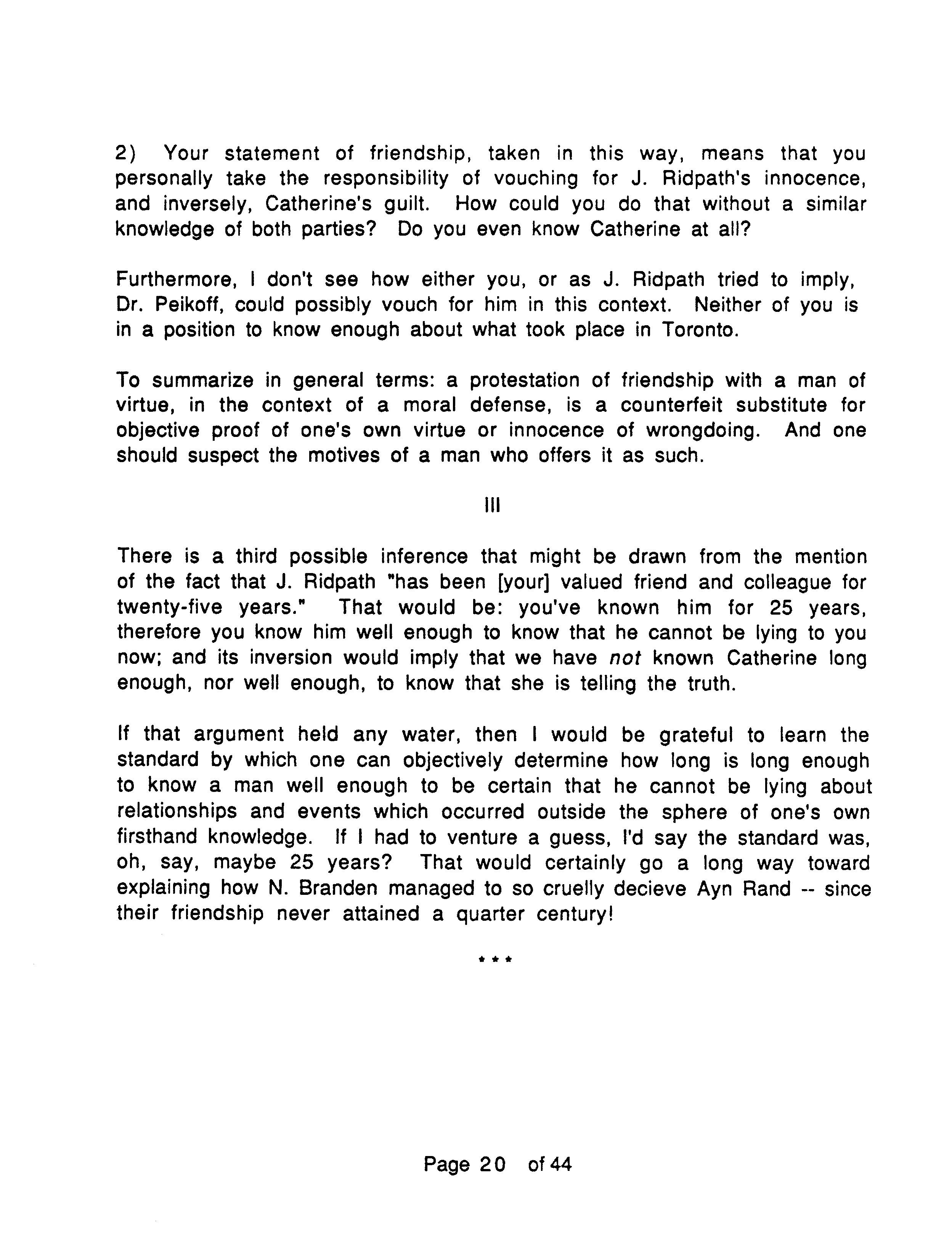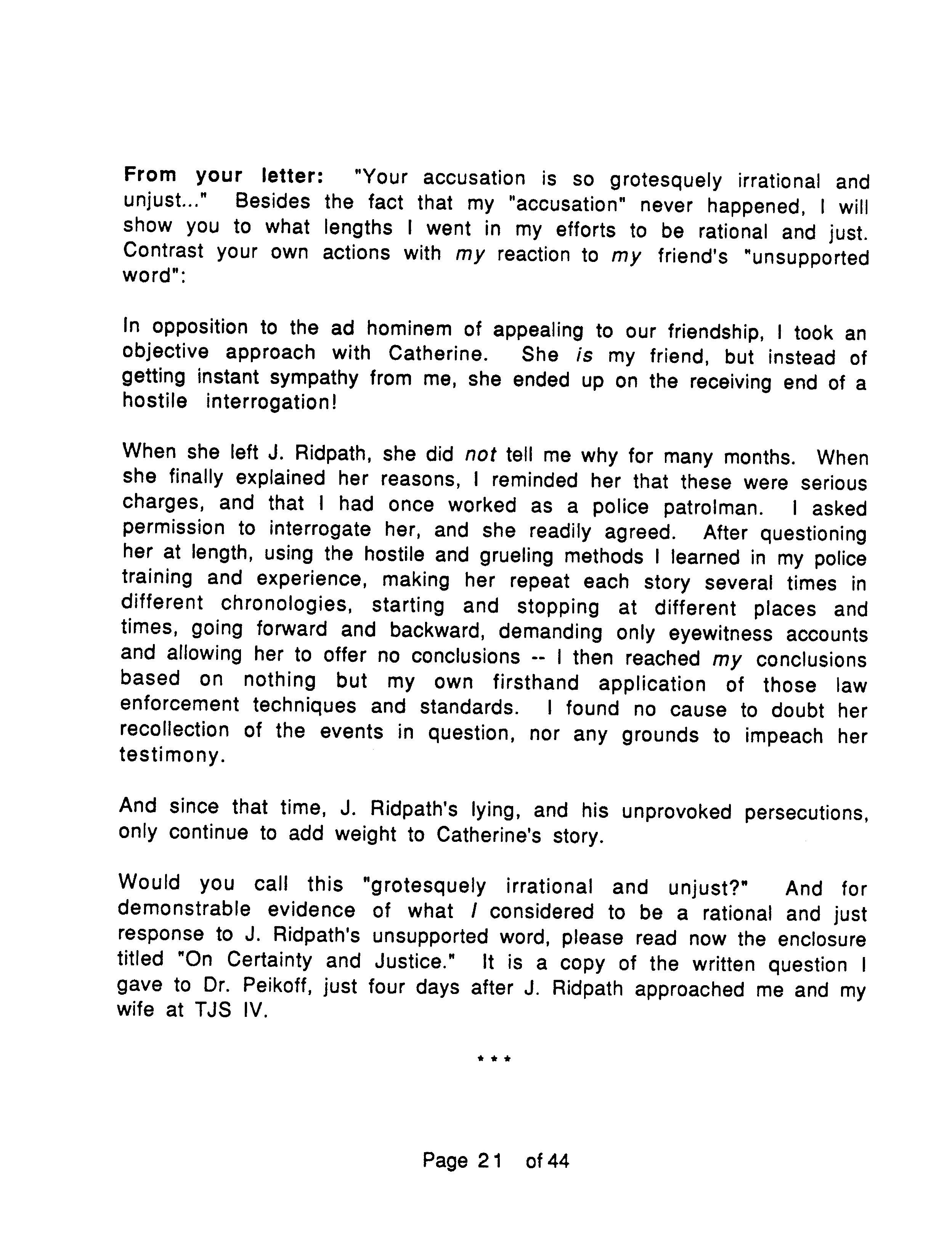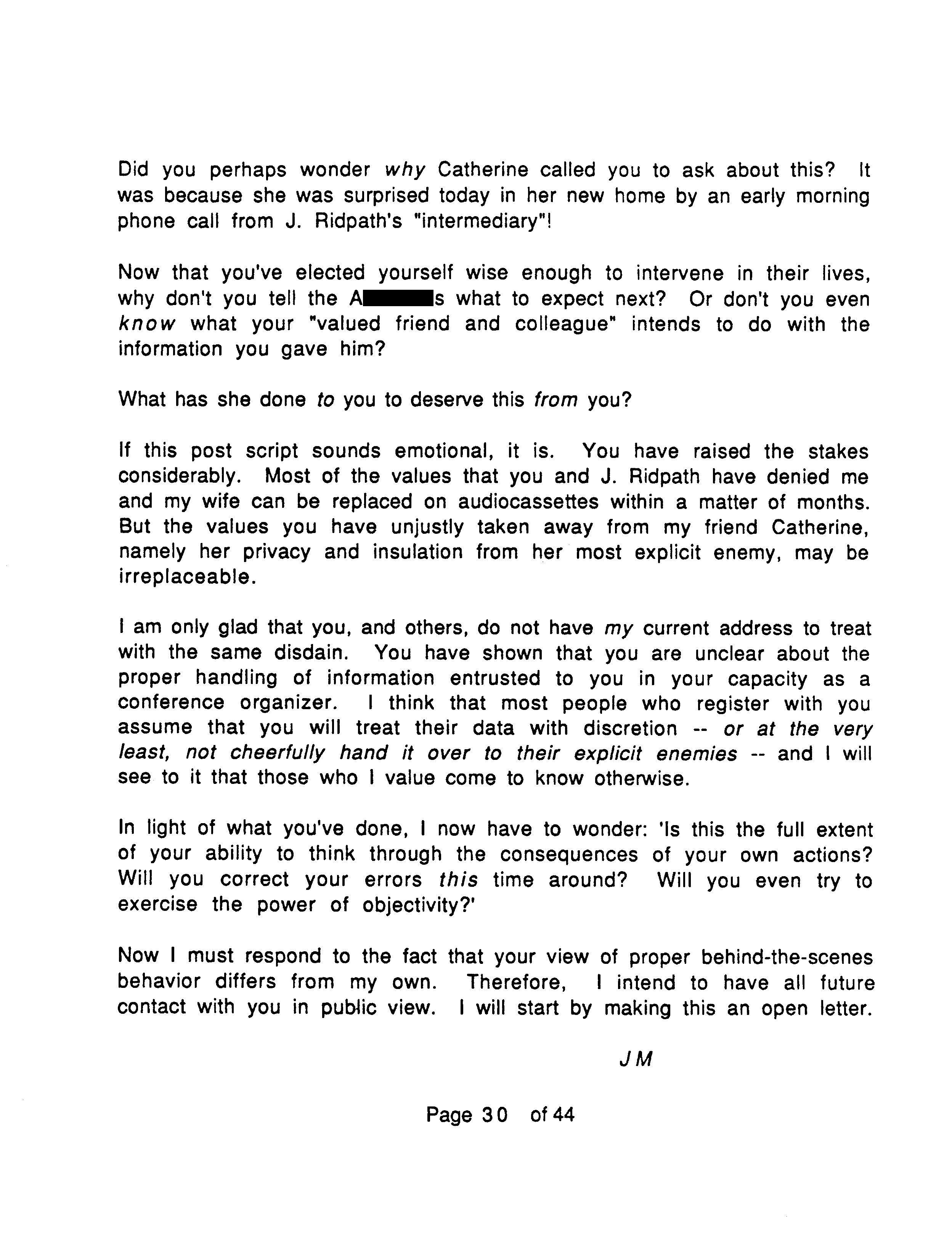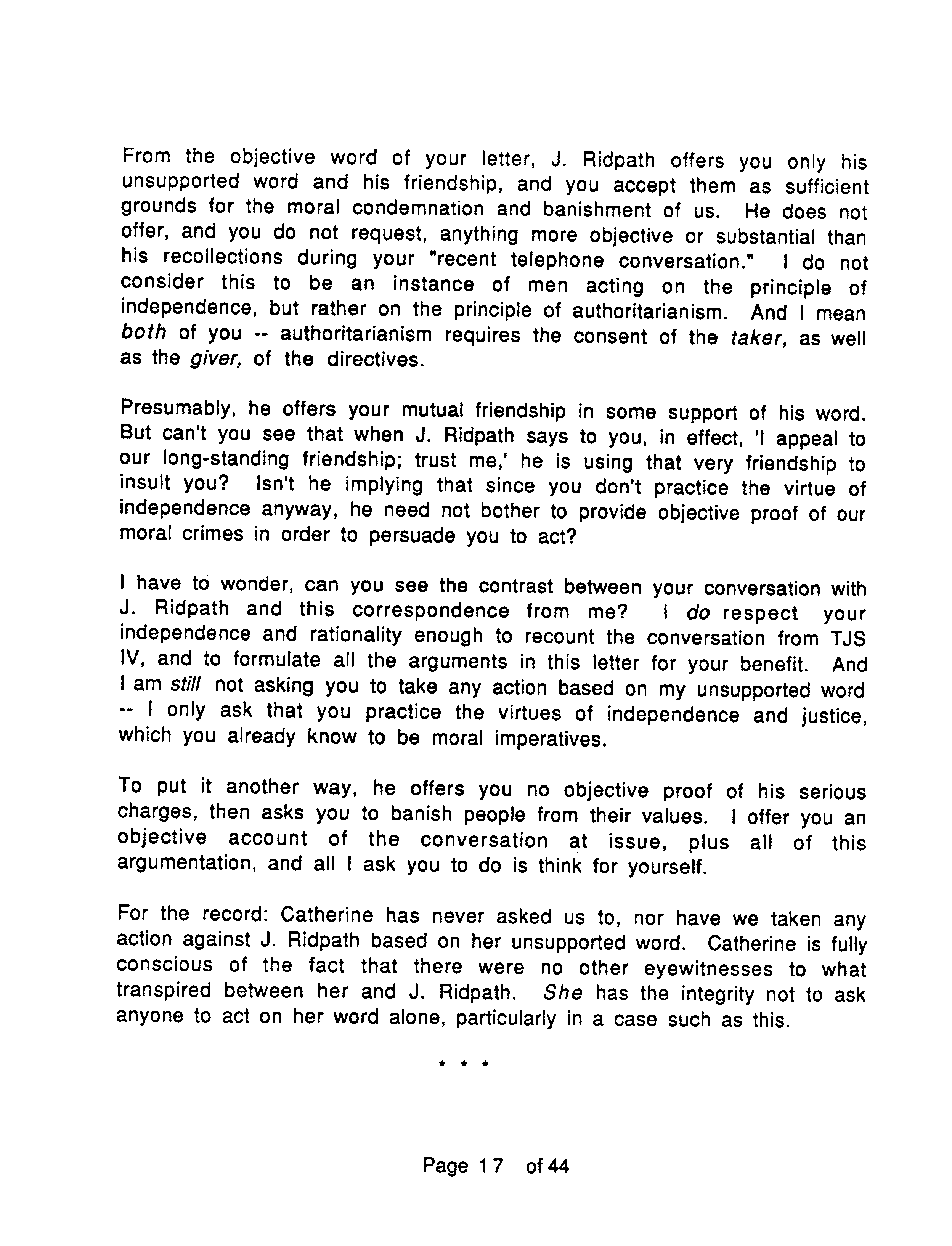 To repeat, J. Marc places the emphasis of OTIPOJ on the fact that Ridpath manipulated leading Objectivists against him, his wife and Catherine, rather than on any assault Ridpath might have committed against Catherine. On the latter point he makes no claim either way, saying that only Ridpath and Catherine know what happened.