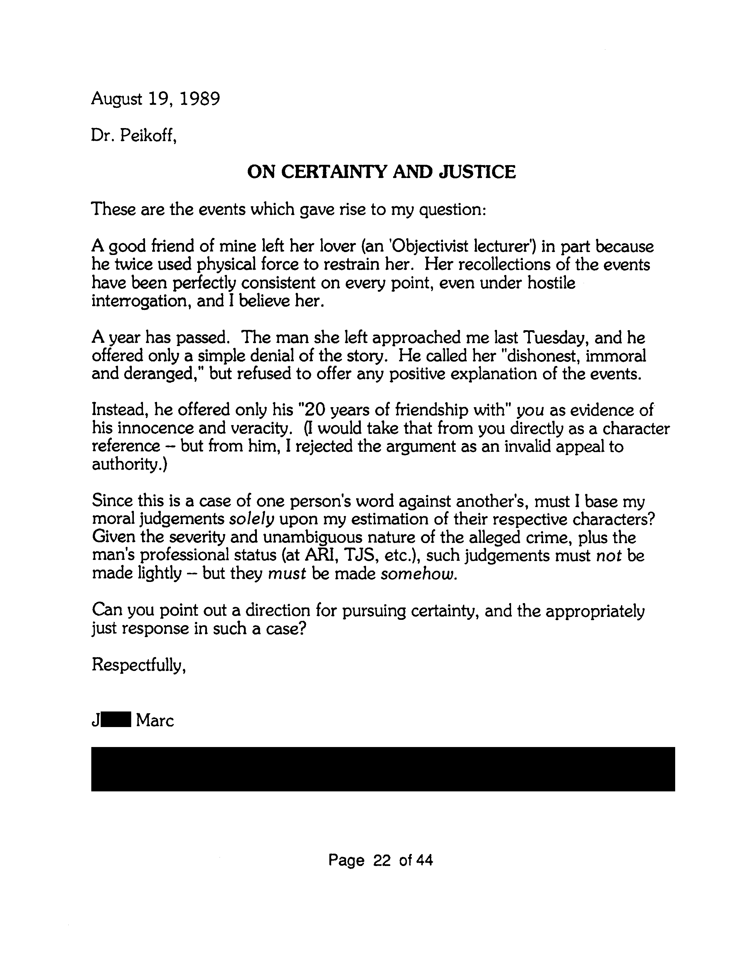 The following is part of a written question J. Marc submitted to Peikoff at the 1989 TJS IV conference and later inserted in the open letter to Buechner (page 22):