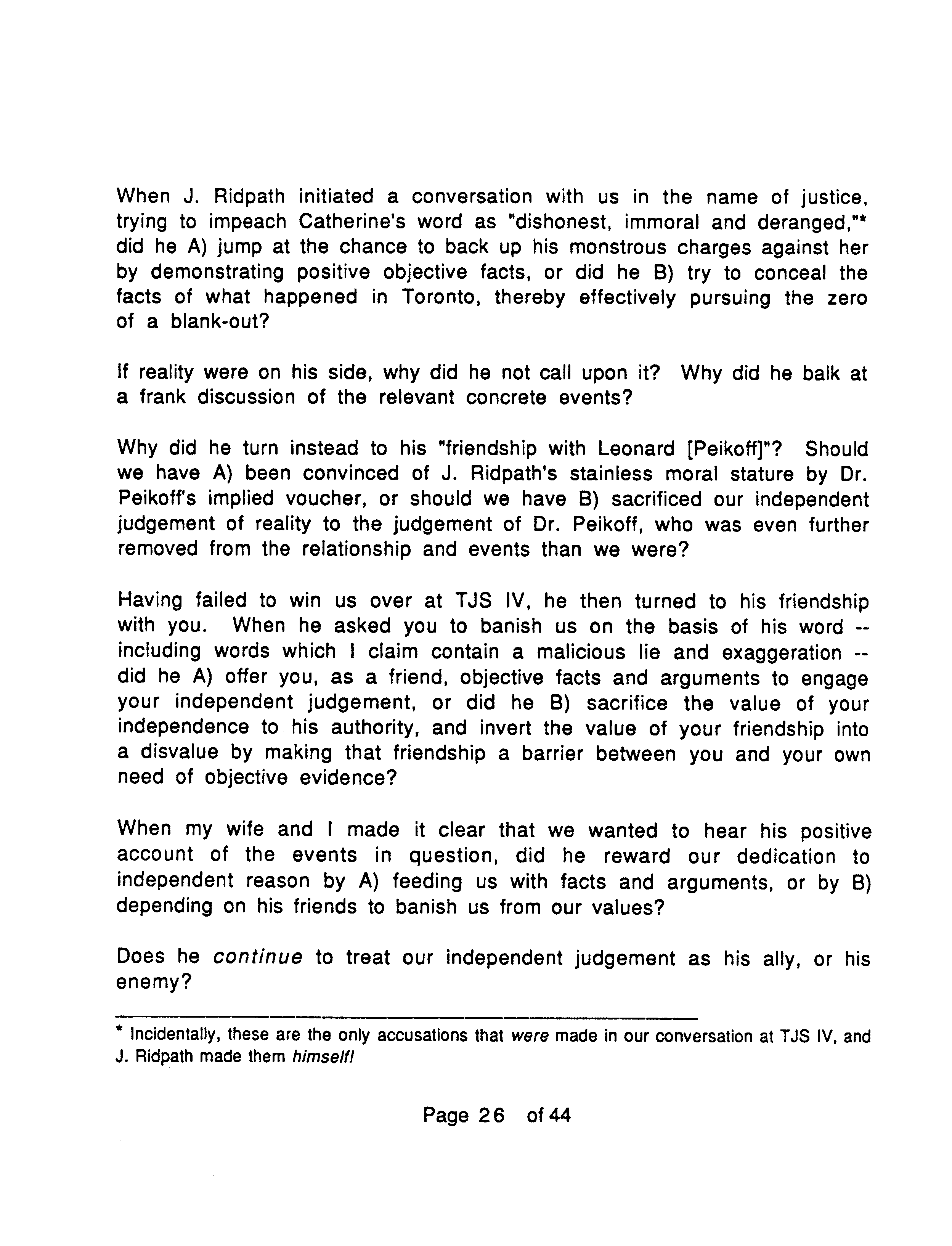 J. Marc states emphatically that he never accused Ridpath of anything. It’s true he never accused Ridpath of rape. However in the written question he submitted to Peikoff (not read aloud) August 19 at the 1989 TJS IV conference (four days after his and his wife’s confrontation with Ridpath) he says an unnamed man who was an Objectivist lecturer “twice used physical force to restrain” a friend of his (Marc’s). He goes on to say that Peikoff had been friends with the man for 20 years. This would have enabled Peikoff to place the man among only a few people.