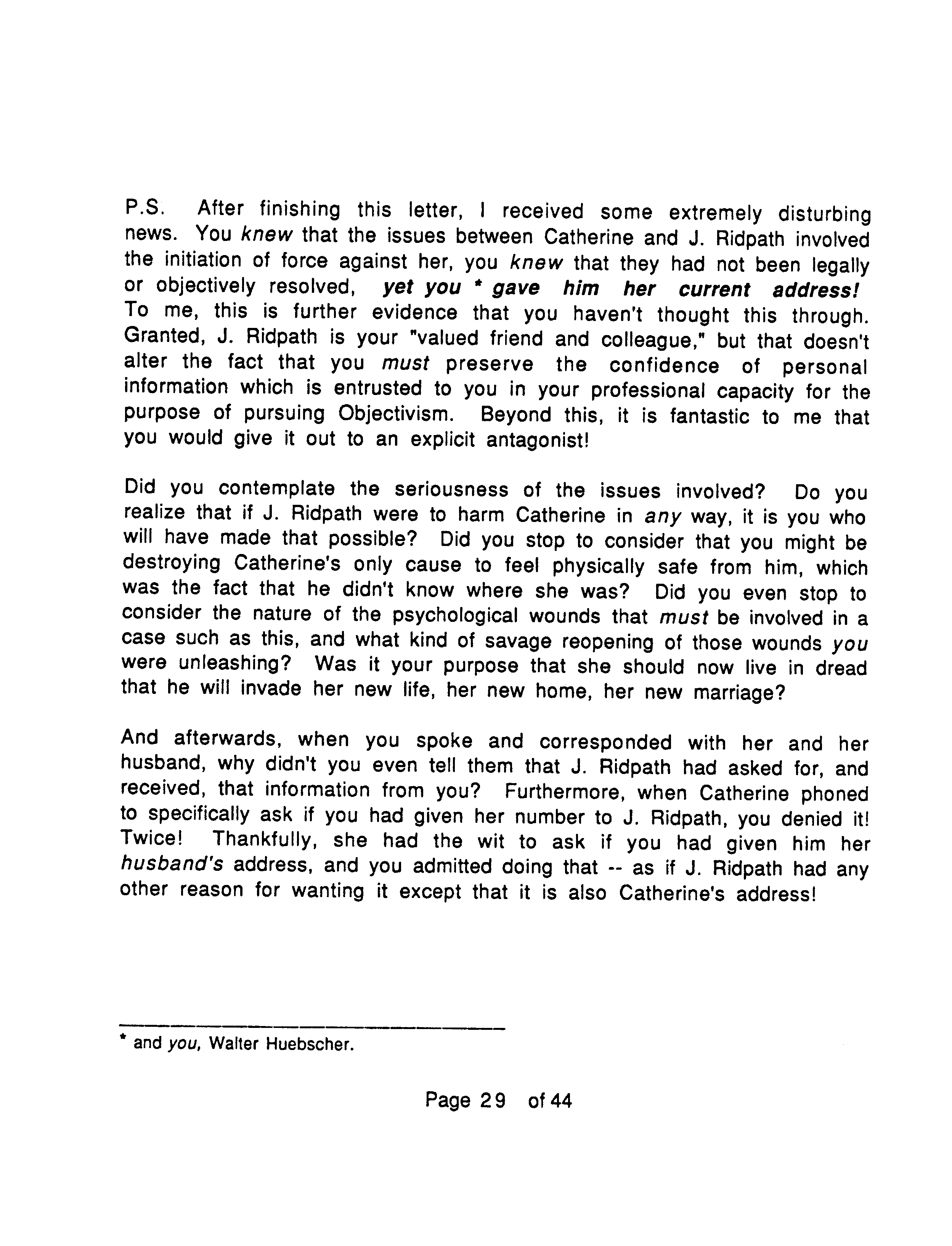 At the end of Catherine’s letter to Huebscher (page 37) she claims: “He forced his sex on me.” The apparently roundabout manner of expression may have been due to her reluctance to speak frankly about her experience, or she may have wanted to emphasize the force aspect, “force” being a trigger word in Objectivist circles.